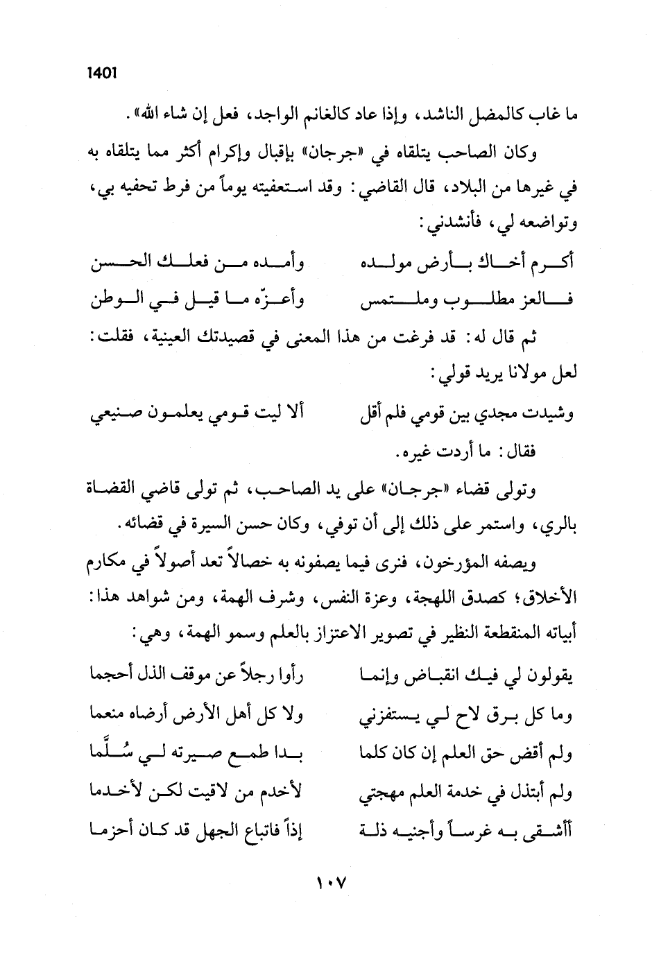 وكان الصاحب يتلقاه في "جرجان" بإقبال وإكرام أكثر مما يتلقاه به في غيرها من البلاد، قال القاضي: وقد استعفيته يوماً من فرط تحفيه بي، وتواضعه لي، فأنشدني: