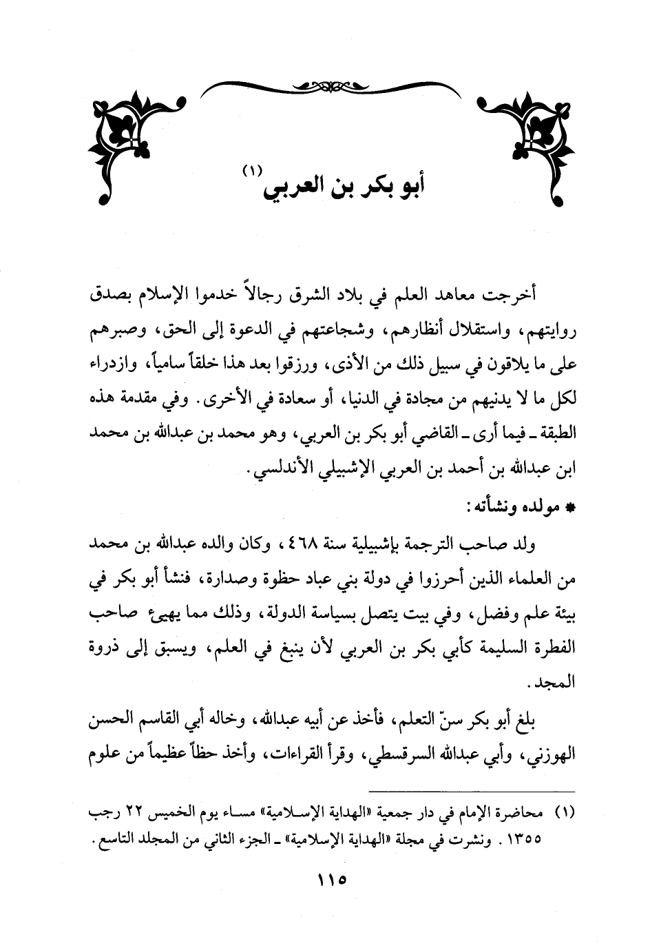 أخرجت معاهد العلم في بلاد الشرق رجالاً خدموا الإسلام بصدق روايتهم، واستقلال أنظارهم، وشجاعتهم في الدعوة إلى الحق، وصبرهم على ما يلاقون في سبيل ذلك من الأذى، ورزقوا بعد هذا خلقاً سامياً، وازدراء لكل ما لا يدنيهم من مجادة في الدنيا، أو سعادة في الأخرى. وفي مقدمة هذه الطبقة- فيما أرى- القاضي أبو بكر بن العربي، وهو محمد بن عبد الله بن محمد ابن عبد الله بن أحمد بن العربي الإشبيلي الأندلسي.