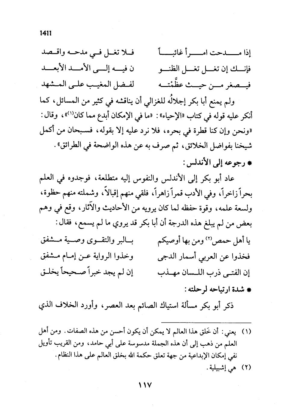ولم يمنع أبا بكر إجلالُه للغزالي أن يناقشه في كثير من المسائل، كما أنكر عليه قوله في كتاب "الإحياء": "ما في الإمكان أبدع مما كان (¬1) "، وقال: "ونحن وإن كنا قطرة في بحره، فلا نرد عليه إلا بقوله، فسبحان من كمل شيخنا بفواضل الخلائق، ثم صرف به عن هذه الواضحة في الطرائق".