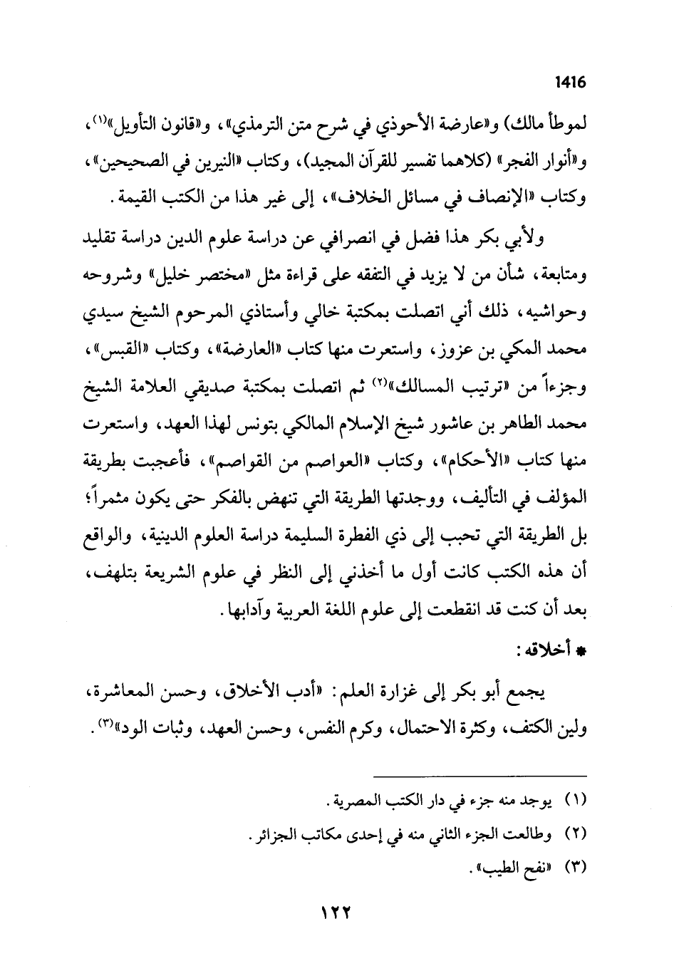 ولأبي بكر هذا فضل في انصرافي عن دراسة علوم الدين دراسة تقليد ومتابعة، شأن من لا يزيد في التفقه على قراءة مثل "مختصر خليل" وشروحه وحواشيه، ذلك أني اتصلت بمكتبة خالي وأستاذي المرحوم الشيخ سيدي محمد المكي بن عزوز، واستعرت منها كتاب "العارضة"، وكتاب "القبس"، وجزءاً من "ترتيب المسالك" (¬2) ثم اتصلت بمكتبة صديقي العلامة الشيخ محمد الطاهر بن عاشور شيخ الإسلام المالكي بتونس لهذا العهد، واستعرت منها كتاب "الأحكام"، وكتاب "العواصم من القواصم"، فأعجبت بطريقة المؤلف في التأليف، ووجدتها الطريقة التي تنهض بالفكر حتى يكون مثمراً؛ بل الطريقة التي تحبب إلى ذي الفطرة السليمة دراسة العلوم الدينية، والواقع أن هذه الكتب كانت أول ما أخذني إلى النظر في علوم الشريعة بتلهف، بعد أن كنت قد انقطعت إلى علوم اللغة العربية وآدابها.