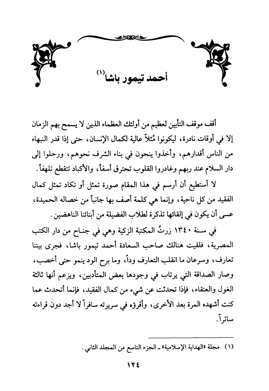 في سنة 1340 زرتُ المكتبة الزكية وهي في جناح من دار الكتب المصرية، فلقيت هنالك صاحب السعادة أحمد تيمور باشا، فجرى بيننا تعارف، وسرعان ما انقلب التعارف وداً، وما برح الود ينمو حتى أخصب، وصار الصداقة التي يرتاب في وجودها بعض المتأدبين، ويزعم أنها ثالثة الغول والعنقاء، فإذا تحدثت عن شيء من كمال الفقيد، فإنما أتحدث عما كنت أشهده المرة بعد الأخرى، وأقرؤه في سريرته سافراً لا أجد دون قراءته ساتراً.