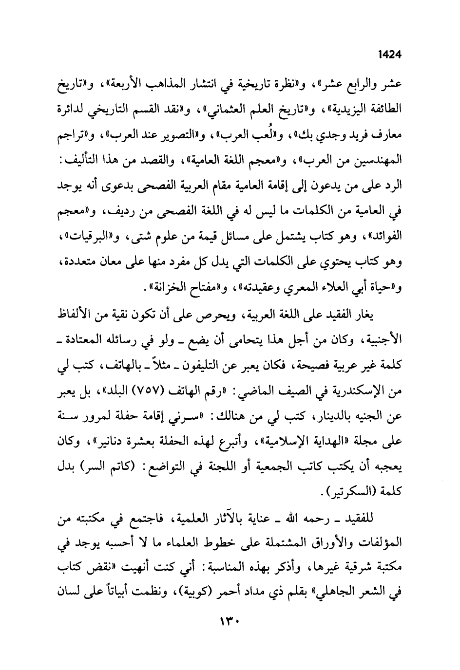 يغار الفقيد على اللغة العربية، ويحرص على أن تكون نقية من الألفاظ الأجنبية، وكان من أجل هذا يتحامى أن يضع- ولو في رسائله المعتادة- كلمة غير عربية فصيحة، فكان يعبر عن التليفون - مثلاً - بالهاتف، كتب لي من الإسكندرية في الصيف الماضي: "رقم الهاتف (757) البلد"، بل يعبر عن الجنيه بالدينار، كتب لي من هنالك: "سرني إقامة حفلة لمرور سنة على مجلة "الهداية الإسلامية"، وأتبرع لهذه الحفلة بعشرة دنانير"، وكان يعجبه أن يكتب كاتب الجمعية أو اللجنة في التواضع: (كاتم السر) بدل كلمة (السكرتير).