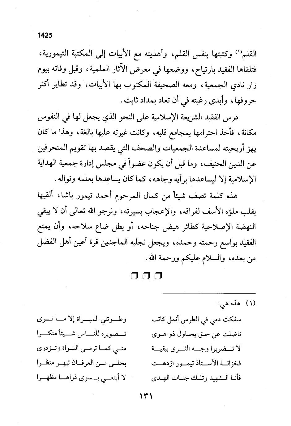 القلم (¬1) وكتبتها بنفس القلم، وأهديته مع الأبيات إلى المكتبة التيمورية، فتلقاها الفقيد بارتياح، ووضعها في معرض الآثار العلمية، وقبل وفاته بيوم زار نادي الجمعية، ومعه الصحيفة المكتوب بها الأبيات، وقد تطاير أكثر حروفها، وأبدى رغبته في أن تعاد بمداد ثابت.