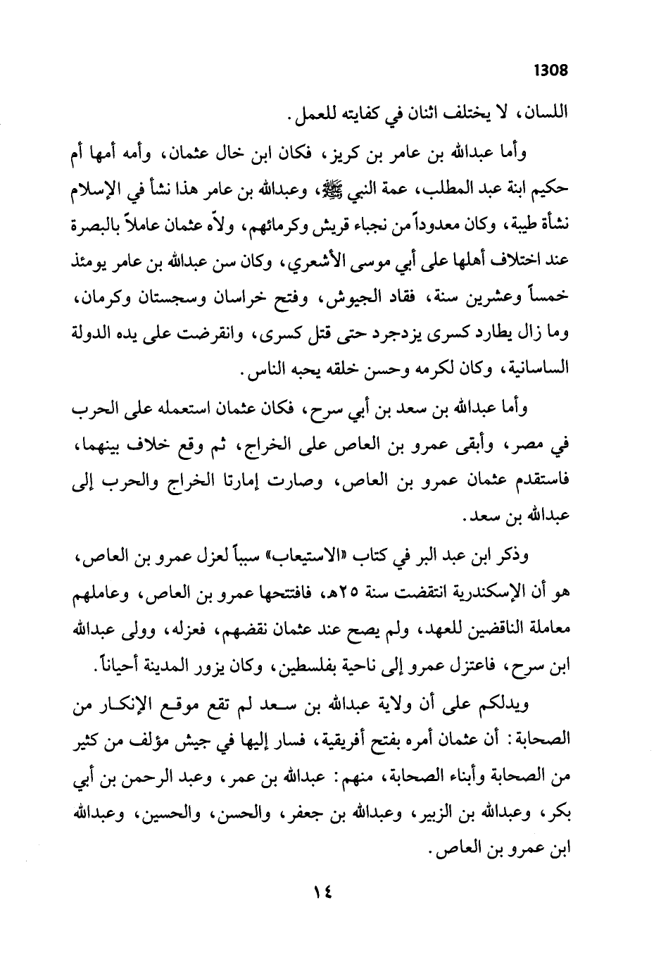 وأما عبد الله بن عامر بن كريز، فكان ابن خال عثمان، وأمه أمها أم حكيم ابنة عبد المطلب، عمة النبي - صلى الله عليه وسلم -، وعبد الله بن عامر هذا نشأ في الإسلام نشأة طيبة، وكان معدودًا من نجباء قريش وكرمائهم، ولّاه عثمان عاملاً بالبصرة عند اختلاف أهلها على أبي موسى الأشعري، وكان سن عبد الله بن عامر يومئذ خمساً وعشرين سنة، فقاد الجيوش، وفتح خراسان وسجستان وكرمان، وما زال يطارد كسرى يزدجرد حتى قتل كسرى، وانقرضت على يده الدولة الساسانية، وكان لكرمه وحسن خلقه يحبه الناس.