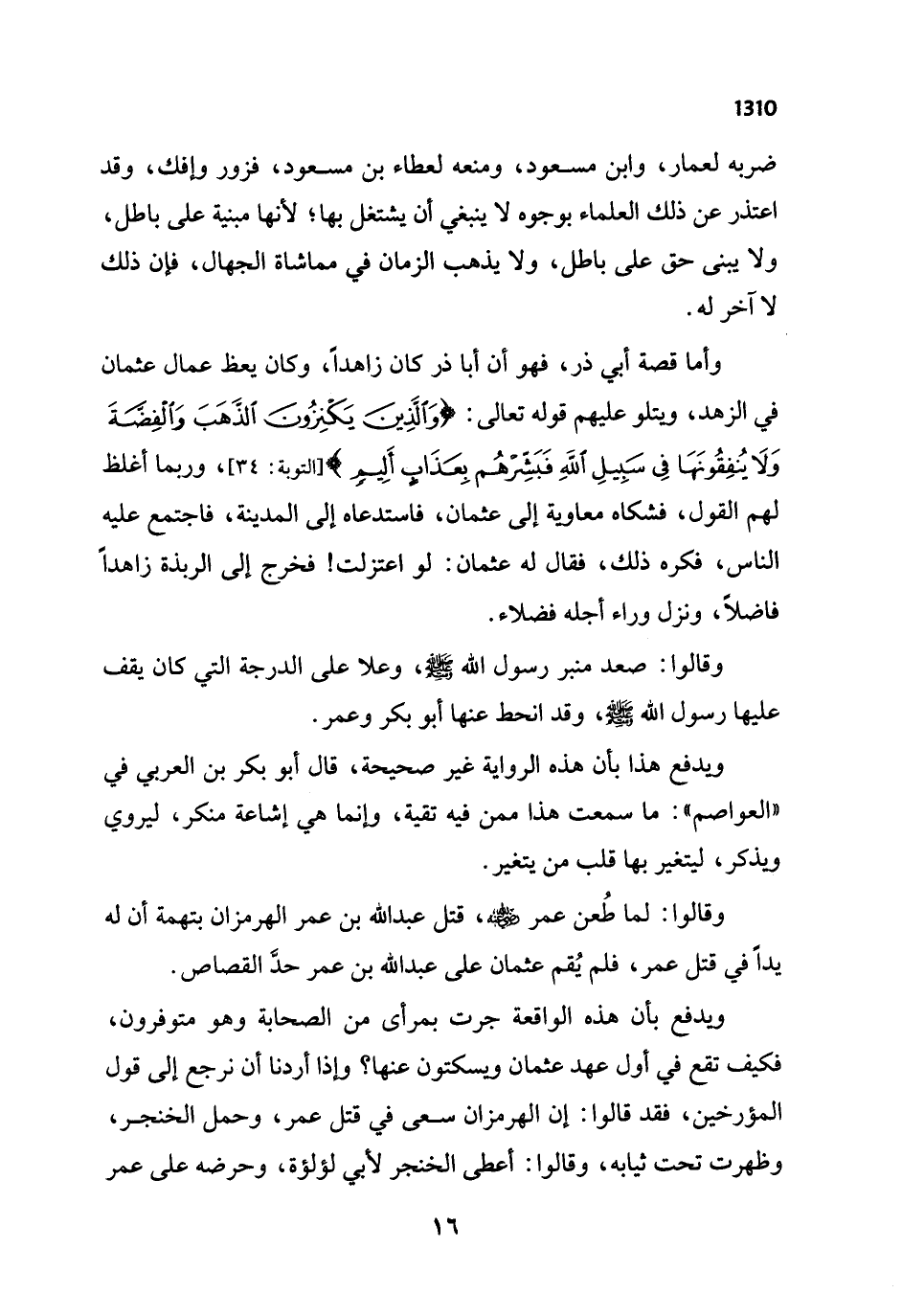 ضربه لعمار، وابن مسعود، ومنعه لعطاء بن مسعود، فزور وإفك، وقد اعتذر عن ذلك العلماء بوجوه لا ينبغي أن يشتغل بها؛ لأنها مبنية على باطل، ولا يبنى حق على باطل، ولا يذهب الزمان في مماشاة الجهال، فإن ذلك لا آخر له.
