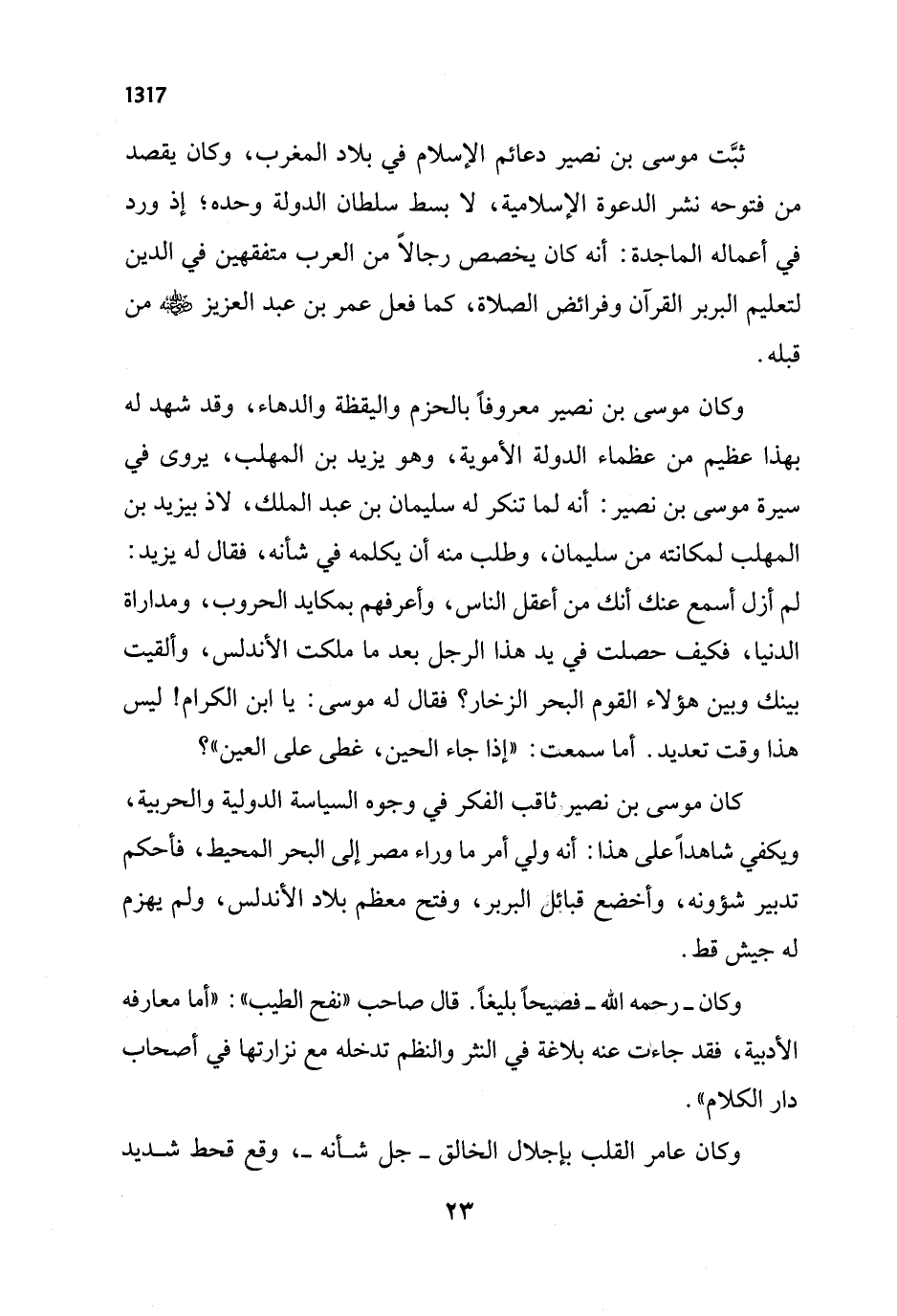 ثبَّت موسى بن نصير دعائم الإسلام في بلاد المغرب، وكان يقصد من فتوحه نشر الدعوة الإسلامية، لا بسط سلطان الدولة وحده؛ إذ ورد في أعماله الماجدة: أنه كان يخصص رجالًا من العرب متفقهين في الدين لتعليم البربر القرآن وفرائض الصلاة، كما فعل عمر بن عبد العزيز - رضي الله عنه - من قبله.