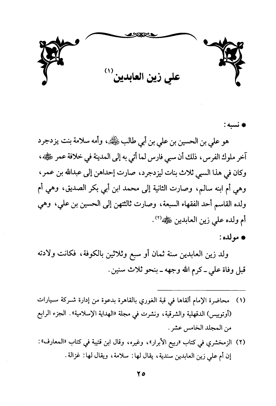 هو علي بن الحسين بن علي بن أبي طالب - رضي الله عنهم -، وأمه سلامة بنت يزدجر آخر ملوك الفرس، ذلك أن سبي فارس لما أتي به إلى المدينة في خلافة عمر - رضي الله عنه -، وكان في هذا السبي ثلاث بنات ليزدجرد، صارت إحداهن إلى عبد اللُّه بن عمر، وهي أم ابنه سالم، وصارت الثانية إلى محمد ابن أبي بكر الصديق، وهي أم ولده القاسم أحد الفقهاء السبعة، وصارت ثالثتهن إلى الحسين بن علي، وهي أم ولده علي زين العابدين - رضي الله عنه - (¬2).