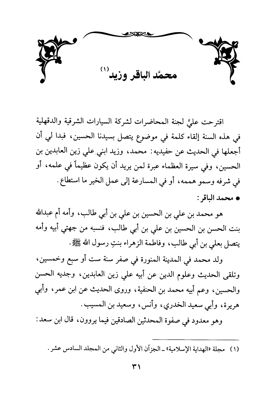 اقترحت عليَّ لجنة المحاضرات لشركة السيارات الشرقية والدقهلية في هذه السنة إلقاء كلمة في موضوع يتصل بسيدنا الحسين، فبدا لي أن أجعلها في الحديث عن حفيديه: محمد، وزيد ابني اعلي زين العابدين بن الحسين، وفي سيرة العظماء عبرة لمن يريد أن يكون عظيماً في علمه، أو في شرفه وسمو هممه، أو في المسارعة إلى عمل الخير ما استطاع.