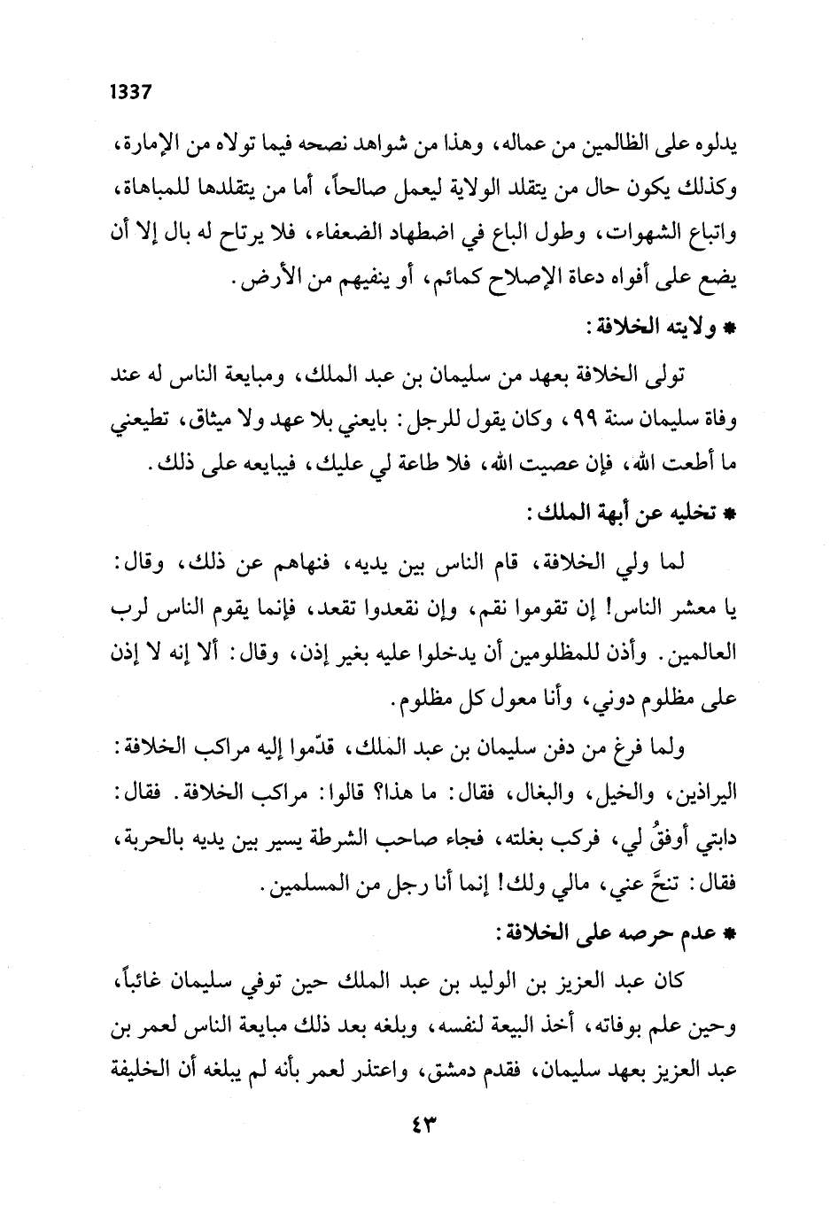 ولما فرغ من دفن سليمان بن عبد الفلك، قدّموا إليه مراكب الخلافة: اليراذين، والخيل، والبغال، فقال: ما هذا؟ قالوا: مراكب الخلافة. فقال: دابتي أوفقُ لي، فركب بغلته، فجاء صاحب الشرطة يسير بين يديه بالحربة، فقال: تنحَّ عني، مالي ولك! إنما أنا رجل من المسلمين.