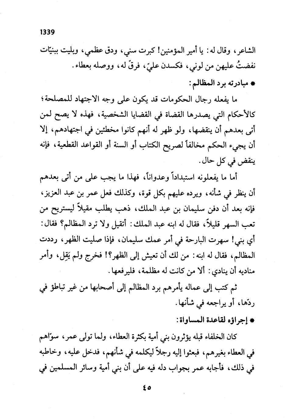 أما ما يفعلونه استبداداً وعدواناً، فهذا ما يجب على من أتى بعدهم أن ينظر في شأنه، ويرده عليهم بكل قوة، وكذلك فعل عمر بن عبد العزيز، فإنه بعد أن دفن سليمان بن عبد الملك، ذهب يطلب مقيلًا ليستريح من تعب السهر قليلاً، فقال له ابنه عبد الملك: أتقيل ولا ترد المظالم؟ فقال: أي بني! سهرت البارحة في أمر عمك سليمان، فإذا صليت الظهر، رددت المظالم، فقال له ابنه: من لك أن تعيش إلى الظهر؟! فخرج ولم يَقِل، وأمر مناديه أن ينادي: ألا من كانت له مظلمة، فليرفعها.