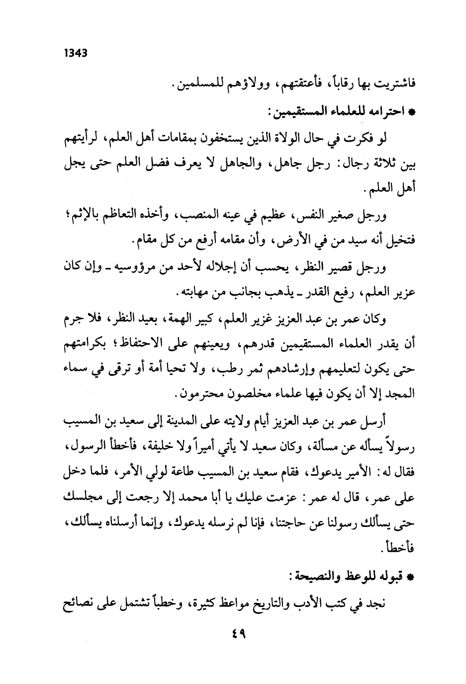 أرسل عمر بن عبد العزيز أيام ولايته على المدينة إلى سعيد بن المسيب رسولًا يسأله عن مسألة، وكان سعيد لا يأتي أميراً ولا خليفة، فاخطأ الرسول، فقال له: الأمير يدعوك، فقام سعيد بن المسيب طاعة لولي الأمر، فلما دخل على عمر، قال له عمر: عزمت عليك يا أبا محمد إلا رجعت إلى مجلسك حتى يسألك رسولنا عن حاجتنا، فإنا لم نرسله يدعوك، وإنما أرسلناه يسألك، فأخطأ.