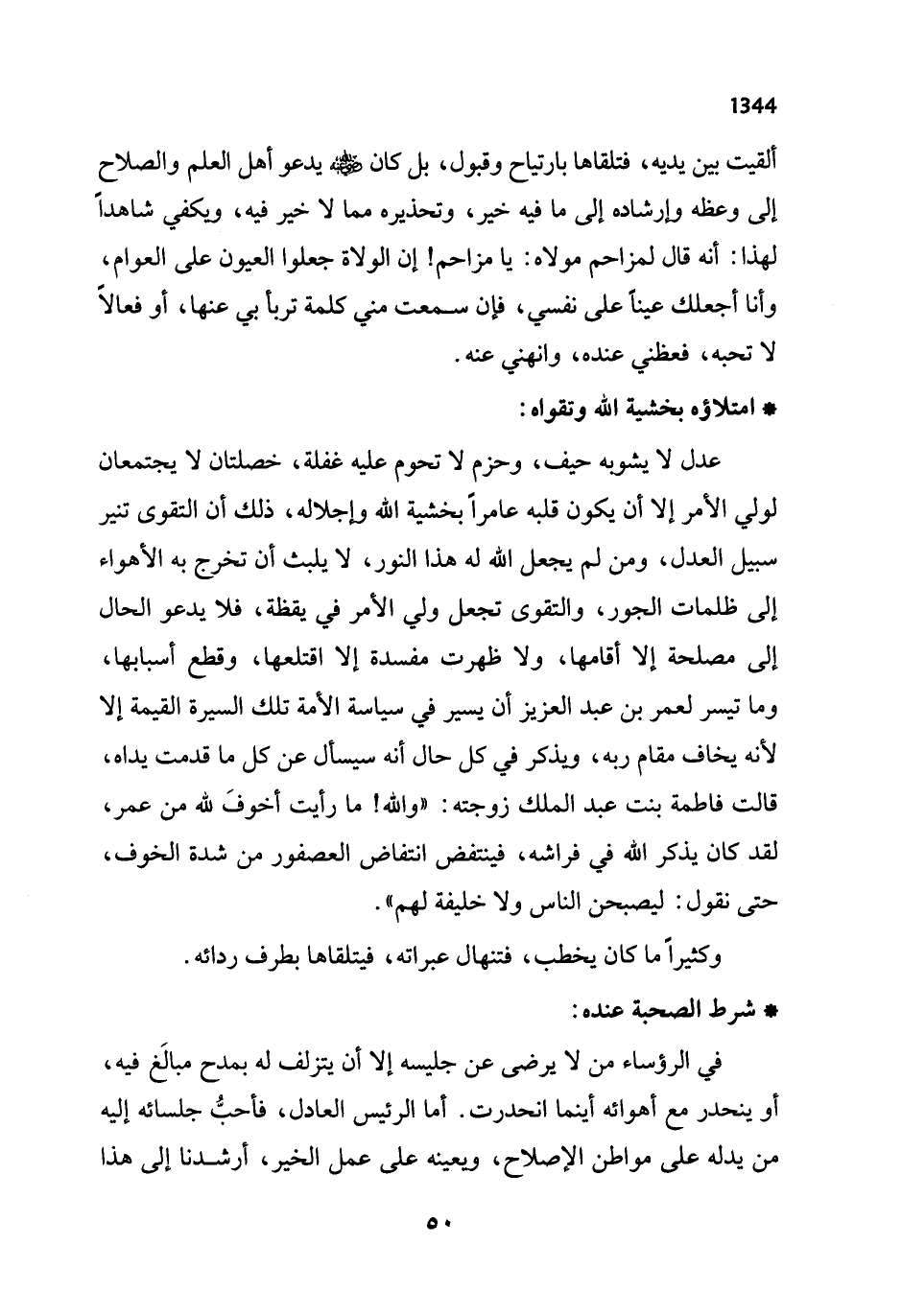 عدل لا يشوبه حيف، وحزم لا تحوم عليه غفلة، خصلتان لا يجتمعان لولي الأمر إلا أن يكون قلبه عامرًا بخشية الله وإجلاله، ذلك أن التقوى تنير سبيل العدل، ومن لم يجعل الله له هذا النور، لا يلبث أن تخرج به الأهواء إلى ظلمات الجور، والتقوى تجعل ولي الأمر في يقظة، فلا يدعو الحال إلى مصلحة إلا أقامها، ولا ظهرت مفسدة إلا اقتلعها، وقطع أسبابها، وما تيسر لعمر بن عبد العزيز أن يسير في سياسة الأمة تلك السيرة القيمة إلا لأنه يخاف مقام ربه، ويذكر في كل حال أنه سيسأل عن كل ما قدمت يداه، قالت فاطمة بنت عبد الملك زوجته: "والله! ما رأيت أخوفَ لله من عمر، لقد كان يذكر الله في فراشه، فينتفض انتفاض العصفور من شدة الخوف، حتى نقول: ليصبحن الناس ولا خليفة لهم".