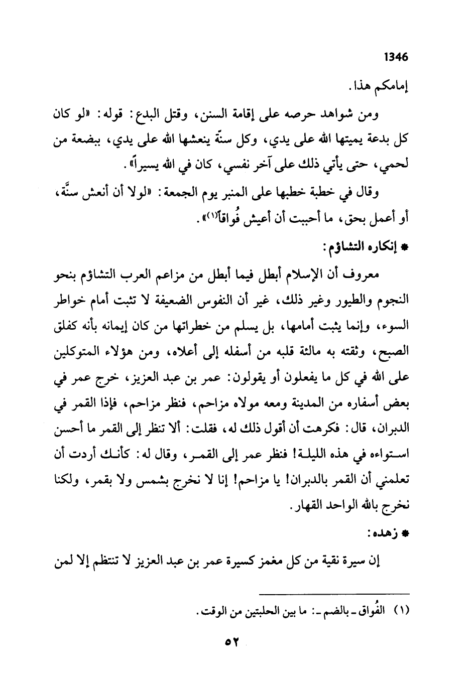 معروف أن الإسلام أبطل فيما أبطل من مزاعم العرب التشاؤم بنحو النجوم والطيور وغير ذلك، غير أن النفوس الضعيفة لا تئبت أمام خواطر السوء، وإنما يثبت أمامها، بل يسلم من خطراتها من كان إيمانه بأنه كفلق الصبح، وثقته به مالئة قلبه من أسفله إلى أعلاه، ومن هؤلاء المتوكلين على الله في كل ما يفعلون أو يقولون: عمر بن عبد العزيز، خرج عمر في بعض أسفاره من المدينة ومعه مولاه مزاحم، فنظر مزاحم، فإذا القمر في الدبران، قال: فكرهت أن أقول ذلك له، فقلت: ألا تنظر إلى القمر ما أحسن استواءه في هذه الليلة! فنظر عمر إلى القمر، وقال له: كأنك أردت أن تعلمني أن القمر بالدبران! يا مزاحم! إنا لا نخرج بشمس ولا بقمر، ولكنا نخرج بالله الواحد القهار.