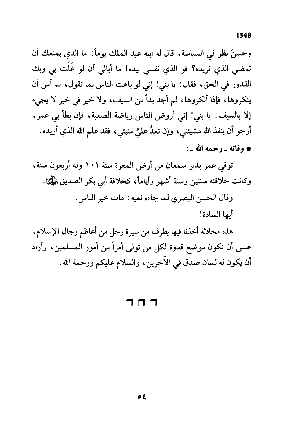 هذه محادثة أخذنا فيها بطرف من سيرة رجل من أعاظم رجال الإسلام، عسى أن تكون موضع قدوة لكل من تولى أمراً من أمور المسلمين، وأراد أن يكون له لسان صدق في الآخرين، والسلام عليكم ورحمة الله.