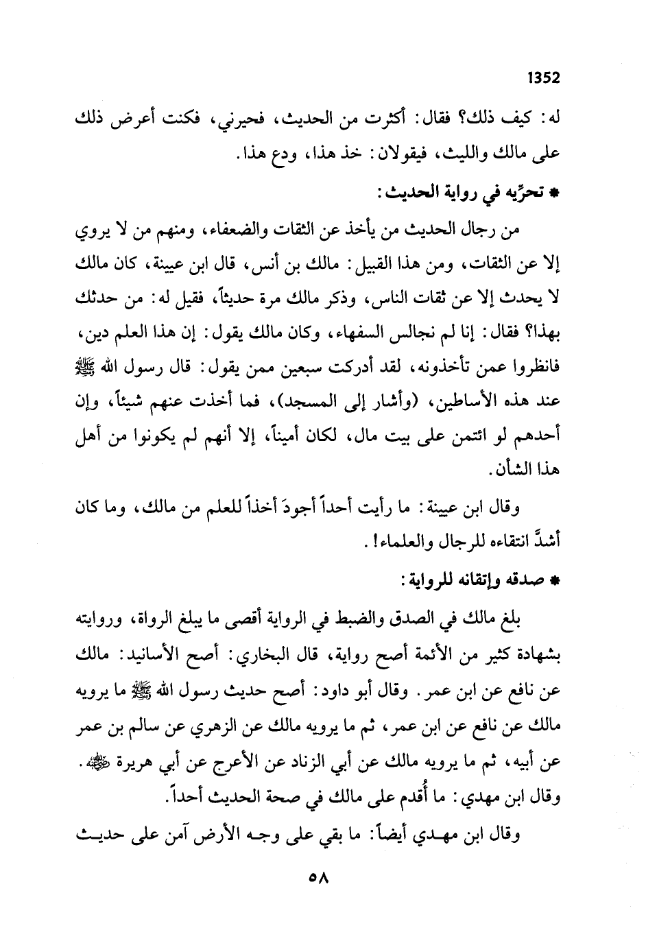 من رجال الحديث من يأخذ عن الثقات والضعفاء، ومنهم من لا يروي إلا عن الثقات، ومن هذا القبيل: مالك بن أنس، قال ابن عيينة، كان مالك لا يحدث إلا عن ثقات الناس، وذكر مالك مرة حديثاً، فقيل له: من حدثك بهذا؟ فقال: إنا لم نجالس السفهاء، وكان مالك يقول: إن هذا العلم دين، فانظروا عمن تأخذونه، لقد أدركت سبعين ممن يقول: قال رسول الله - صلى الله عليه وسلم - عند هذه الأساطين، (وأشار إلى المسجد)، فما أخذت عنهم شيئاً، وإن أحدهم لو ائتمن على بيت مال، لكان أميناً، إلا أنهم لم يكونوا من أهل هذا الشأن.