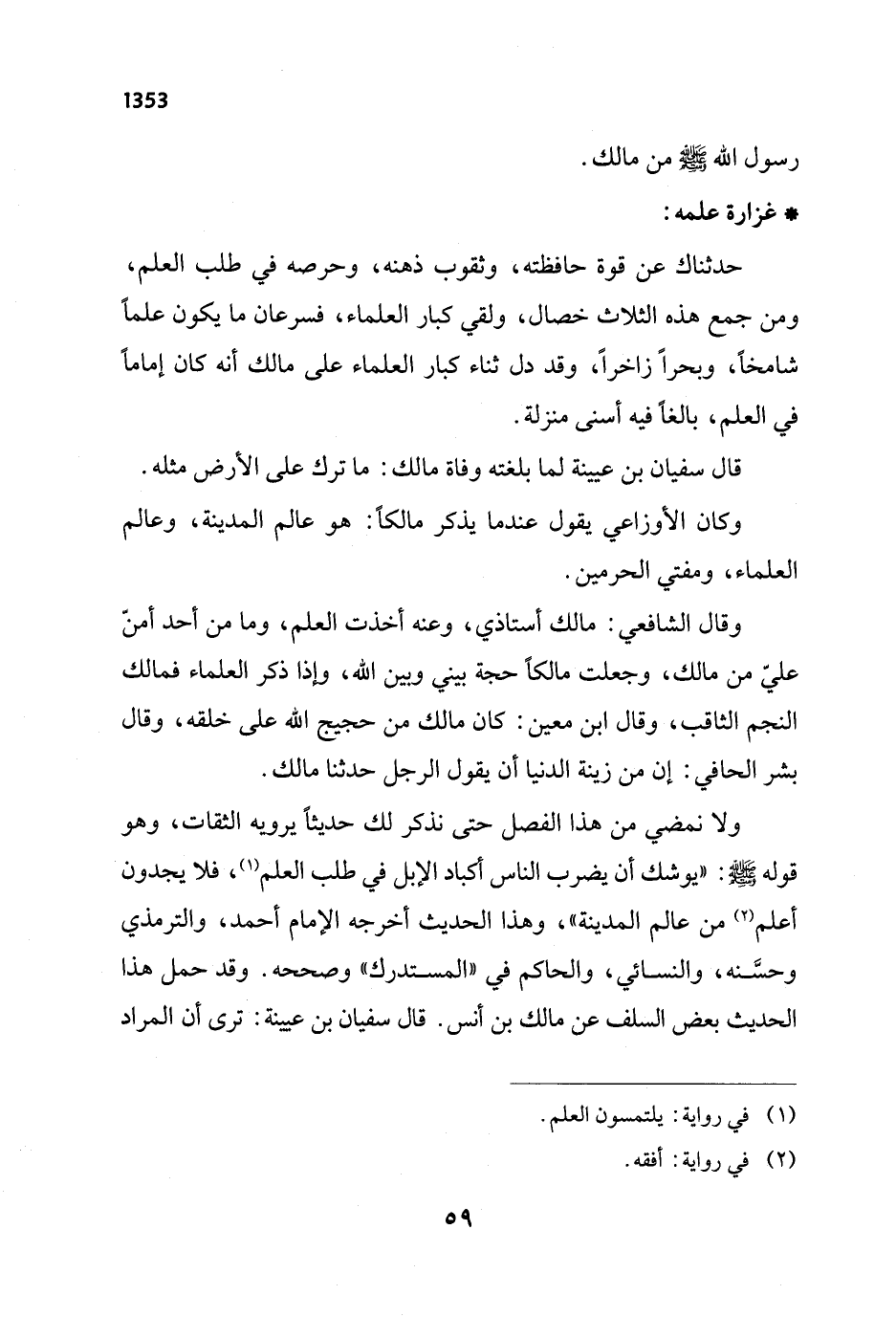 ولا نمضي من هذا الفصل حتى نذكر لك حديثاً يرويه الثقات، وهو قوله - صلى الله عليه وسلم -: "يوشك أن يضرب الناس- أكباد الإبل في طلب العلم (¬1)، فلا يجدون أعلم (¬2) من عالم المدينة"، وهذا الحديث أخرجه الإمام أحمد، والترمذي وحسَّنه، والنسائي، والحاكم في "المستدرك" وصححه. وقد حمل هذا الحديث بعض السلف عن مالك بن أنس. قال سفيان بن عيينة: ترى أن المراد