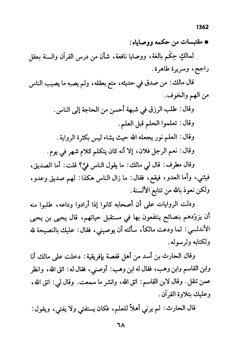 لمالكٍ حِكَم بالغة، ووصايا نافعة، شأن من درس القرآن والسنة بعقل راجح، وسريرة طا هرة؛.