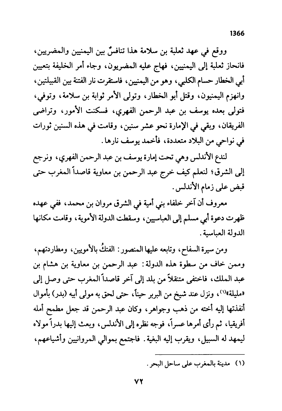 ومن سيرة السفاح، وتابعه عليها المنصور: الفتكُ بالأموميين، ومطاردتهم، وممن خاف من سطوة هذه الدولة: عبد الرحمن بن معاوية بن هشام بن عبد الملك، فاختفى متنقلًا من بلد إلى آخر قاصداً المغرب حتى وصل إلى "مليلة" (¬1)، ونزل عند شيخ من البربر حيناً، حتى لحق به مولى أبيه (بدر) بأموال أنفذتها إليه أخته من ذهب وجواهر، وكان عبد الرحمن قد جعل مطمح أمله أفريقيا، ثم رأى أمرها عسراً، فوجه نظره إلى الأندلس، وبعث إليها بدراً مولاه ليمهد له السبيل، ويقرب إليه البغية. فاجتمع بموالي المروانيين وأشياعهم،