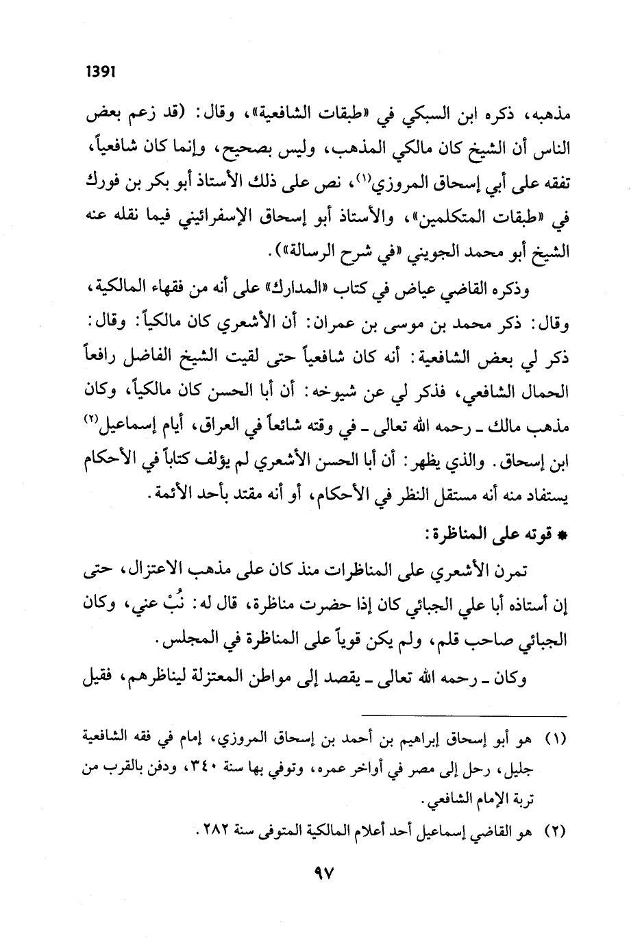 وذكره القاضي عياض في كتاب "المدارك" على أنه من فقهاء المالكية، وقال: ذكر محمد بن موسى بن عمران: أن الأشعري كان مالكياً: وقال: ذكر لي بعض الشافعية: أنه كان شافعيًا حتى لقيت الشيخ الفاضل رافعًا الحمال الشافعي، فذكر لي عن شيوخه: أن أبا الحسن كان مالكياً، وكان مذهب مالك - رحمه الله تعالى - في وقته شائعا في العراق، أيام إسماعيل (¬2) ابن إسحاق. والذي يظهر: أن أبا الحسن الأشعري لم يؤلف كتاباً في الأحكام يستفاد منه أنه مستقل النظر في الأحكام، أو أنه مقتد بأحد الأئمة.
