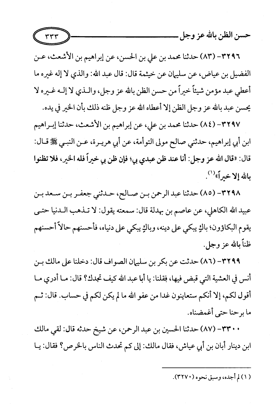 83 - حَدَّثَنَا مُحَمَّدُ بْنُ عَلِيِّ بْنِ الْحَسَنِ، عَنْ إِبْرَاهِيمَ بْنِ الأَشْعَثِ، عَنِ الْفُضَيْلِ بْنِ عِيَاضٍ، عَنْ سُلَيْمَانَ، عَنْ خَيْثَمَةَ، قَالَ: قَالَ عَبْدُ اللهِ: وَالَّذِي لاَ إِلَهَ غَيْرُهُ مَا أُعْطِيَ عَبْدٌ مُؤْمِنٌ شَيْئًا خَيْرًا مِنْ حُسْنِ الظَّنِّ بِاللَّهِ عَزَّ وَجَلَّ وَالَّذِي لاَ إِلَهَ غَيْرُهُ لاَ يُحْسِنُ عَبْدٌ بِاللَّهِ عَزَّ وَجَلَّ الظَّنَّ إِلاَّ أَعْطَاهُ اللَّهُ عَزَّ وَجَلَّ ظَنُّهُ ذَلِكَ بِأَنَّ الْخَيْرَ فِي يَدِهِ.