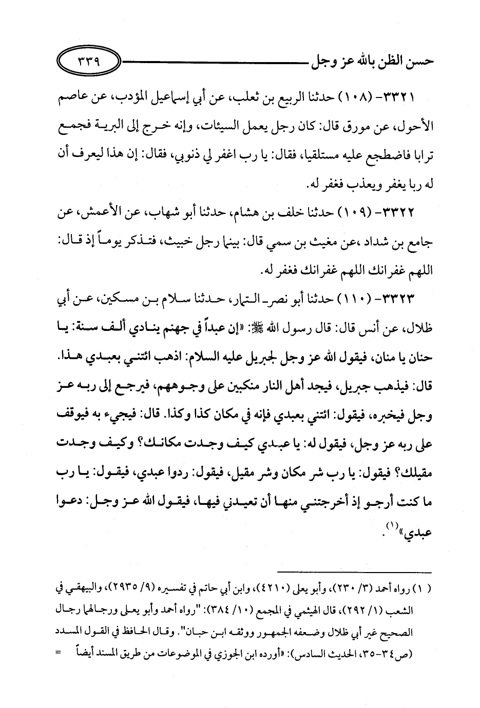 110 - حَدَّثَنَا أَبُو نَصْرٍ التَّمَّارُ، حَدَّثَنَا سَلاَّمُ بْنُ مِسْكِينٍ، عَنْ أَبِي ظِلاَلٍ، عَنْ أَنَسٍ، قَالَ: قَالَ رَسُولُ اللهِ صَلَّى اللَّهُ عَلَيْهِ وَسَلَّمَ: إِنَّ عَبْدًا فِي جَهَنَّمَ يُنَادِي أَلْفَ سَنَةٍ: يَا حَنَّانُ يَا مَنَّانُ فَيَقُولُ اللَّهُ عَزَّ وَجَلَّ لِجِبْرِيلَ عَلَيْهِ السَّلاَمُ: اذْهَبِ ائْتِنِي بِعَبْدِي هَذَا قَالَ: فَيَذْهَبُ جِبْرِيلُ فَيَجِدُ أَهْلَ النَّارِ مُنْكَبِّينَ عَلَى وُجُوهِهِمْ فَيَرْجِعَ إِلَى رَبِّهِ عَزَّ وَجَلَّ فَيُخْبِرُهُ فَيَقُولُ: ائْتِنِي بِعَبْدِي؛ فَإِنَّهُ فِي مَكَانِ كَذَا وَكَذَا قَالَ: فَيَجِيءُ بِهِ فَيُوقَفُ عَلَى رَبِّهِ عَزَّ وَجَلَّ فَيَقُولُ لَهُ: يَا عَبْدِي كَيْفَ وَجَدْتَ مَكَانَكَ؟ وَكَيْفَ وَجَدْتَ مَقِيلَكَ؟ فَيَقُولُ: يَا رَبِّ، شَرُّ مَكَانٍ وَشَرُّ مَقِيلٍ، فَيَقُولُ: رُدُّوا عَبْدِي فَيَقُولُ: يَا رَبِّ، مَا كُنْتُ أَرْجُو إِذْ أَخْرَجْتَنِي مِنْهَا أَنْ تُعِيدَنِي فِيهَا فَيَقُولُ اللَّهُ عَزَّ وَجَلَّ: دَعُوا عَبْدِي.