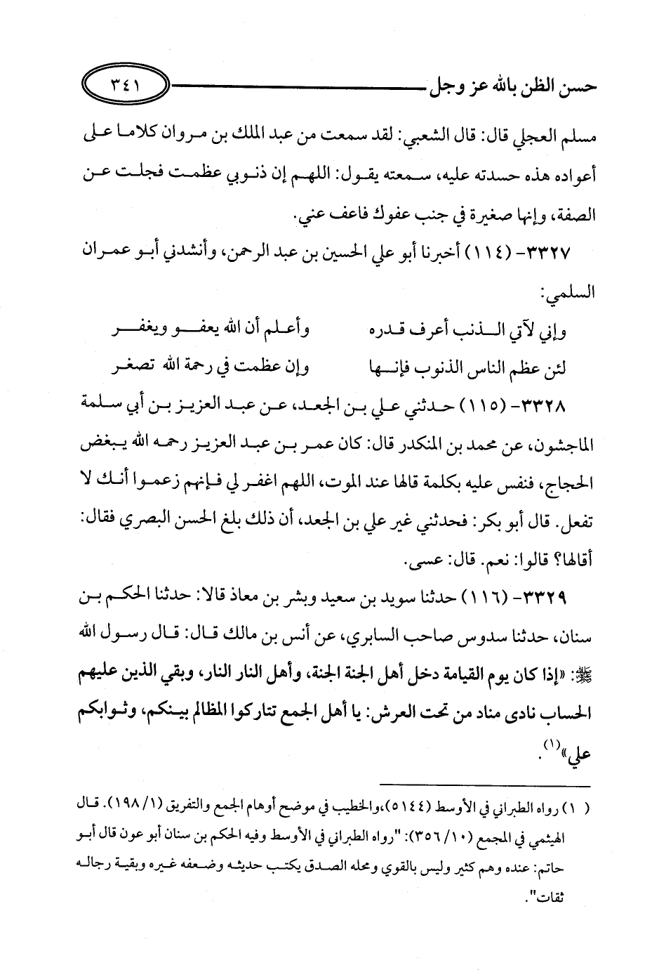 113 - حَدَّثَنِي الْحُسَيْنُ بْنُ عَبْدِ الرَّحْمَنِ، حَدَّثَنِي عَبْدُ اللهِ بْنُ صَالِحِ بْنِ مُسْلِمٍ الْعِجْلِيُّ، قَالَ: قَالَ الشَّعْبِيُّ: لَقَدْ سَمِعْتُ مِنْ عَبْدِ الْمَلِكِ بْنِ مَرْوَانَ كَلاَمًا عَلَى أَعْوَادِهِ هَذِهِ حَسَدْتُهُ عَلَيْهِ سَمِعْتُهُ يَقُولُ: اللَّهُمَّ إِنَّ ذُنُوبِي عَظُمَتْ فَجَلَّتْ عَنِ الصِّفَّةِ، وَإِنَّهَا صَغِيرَةٌ فِي جَنْبِ عَفْوِكَ فَاعْفُ عَنِّي.
