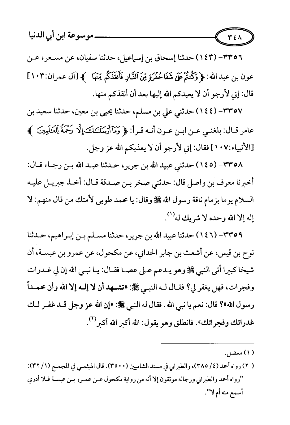 146 - حَدَّثَنَا عُبَيْدُ اللهِ بْنُ جَرِيرٍ، حَدَّثَنَا مُسْلِمُ بْنُ إِبْرَاهِيمَ، حَدَّثَنَا نُوحُ بْنُ قَيْسٍ، عَنْ أَشْعَثَ بْنِ جَابِرِ الْحُدَّانِيِّ، عَنْ مَكْحُولٍ، عَنْ عَمْرِو بْنِ عَبَسَةَ، أَنَّ شَيْخًا كَبِيرًا أَتَى النَّبِيَّ صَلَّى اللَّهُ عَلَيْهِ وَسَلَّمَ وَهُوَ يَدْعَمُ عَلَى عَصًا فَقَالَ: يَا نَبِيَّ اللهِ، إِنَّ لِي غَدَرَاتٍ وَفَجَرَاتٍ فَهَلْ يُغْفَرُ لِي؟ فَقَالَ لَهُ النَّبِيُّ صَلَّى اللَّهُ عَلَيْهِ وَسَلَّمَ: تَشَهَّدُ أَنَّ لاَ إِلَهَ إِلاَّ اللَّهُ وَأَنَّ مُحَمَّدًا رَسُولُ اللهِ قَالَ: نَعَمْ يَا نَبِيَّ اللهِ، فَقَالَ لَهُ النَّبِيُّ صَلَّى اللَّهُ عَلَيْهِ وَسَلَّمَ: إِنِ اللَّهَ عَزَّ وَجَلَّ قَدْ غَفَرَ لَكَ غَدَرَاتِكَ وَفَجَرَاتِكَ فَانْطَلَقَ وَهُوَ يَقُولُ: اللَّهُ أَكْبَرُ اللَّهُ أَكْبَرُ.