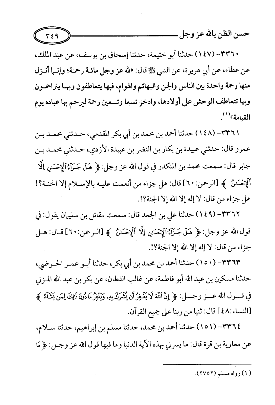 150 - حَدَّثَنَا أَحْمَدُ بْنُ مُحَمَّدِ بْنِ أَبِي بَكْرٍ، حَدَّثَنَا أَبُو عُمَرَ الْحَوْضِيُّ، حَدَّثَنَا مِسْكِينُ بْنُ عَبْدِ اللهِ أَبُو فَاطِمَةَ، عَنْ غَالِبٍ الْقَطَّانِ، عَنْ بَكْرِ بْنِ عَبْدِ اللهِ الْمُزَنِيِّ، فِي قَوْلِهِ عَزَّ وَجَلَّ: {إِنَّ اللَّهَ لاَ يَغْفِرُ أَنْ يُشْرَكَ بِهِ وَيَغْفِرُ مَا دُونَ ذَلِكَ لِمَنْ يَشَاءُ} قَالَ: ثُنْيَا مِنْ رَبِّنَا عَلَى جَمِيعِ الْقُرْآنِ.