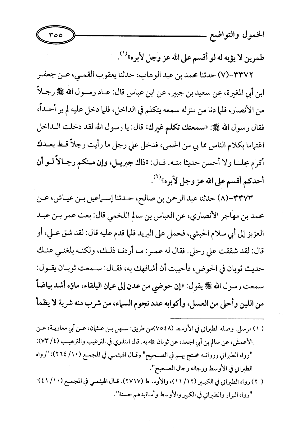 8 - حَدَّثَنَا عَبْدُ الرَّحْمَنِ بْنُ صَالِحٍ، حَدَّثَنَا إِسْمَاعِيلُ بْنُ عَيَّاشٍ، عَنْ مُحَمَّدِ بْنِ مُهَاجِرٍ الأَنْصَارِيِّ، عَنِ الْعَبَّاسِ بْنِ سَالِمٍ اللَّخْمِيِّ، قَالَ: بَعَثَ عُمَرُ بْنُ عَبْدِ الْعَزِيزِ إِلَى أَبِي سَلاَمٍ الْحَبَشِيِّ، فَحُمِلَ عَلَى الْبَرِيدِ، فَلَمَّا قَدِمَ عَلَيْهِ قَالَ: لَقَدْ شَقَّ عَلَيَّ، أَوْ قَالَ: لَقَدْ شَقَقْتَ عَلَيَّ رَحْلِي، فَقَالَ لَهُ عُمَرُ: مَا أَرَدْنَا ذَلِكَ، وَلَكِنَّهُ بَلَغَنِي عَنْكَ حَدِيثُ ثَوْبَانَ فِي الْحَوْضِ، فَأَحْبَبْتُ أَنْ أُشَافِهَكَ بِهِ، فَقَالَ: سَمِعْتُ ثَوْبَانَ يَقُولُ: سَمِعْتُ رَسُولَ اللهِ صَلَّى اللَّهُ عَلَيْهِ وَسَلَّمَ يَقُولُ: إِنَّ حَوْضِي مِنْ عَدَنَ إِلَى عَمَّانَ الْبَلْقَاءِ، مَاؤُهُ أَشَدُّ بَيَاضًا مِنَ اللَّبَنِ، وَأَحْلَى مِنَ الْعَسَلِ، وَأَكْوَابُهُ عَدَدُ نُجُومِ السَّمَاءِ، مَنْ شَرِبَ مِنْهُ شَرْبَةً لاَ يَظْمَأُ بَعْدَهَا أَبَدًا، أَوَّلُ النَّاسِ وُرُودًا عَلَيْهِ فُقَرَاءُ الْمُهَاجِرِينَ، فَقَالَ عُمَرُ بْنُ الْخَطَّابِ: [مَنْ هُمْ يَا رَسُولَ اللهِ؟ قَالَ]: هُمُ الشُّعْثُ رُؤُوسًا، الدُّنْسُ ثِيَابًا، الَّذِينَ لاَ يَنْكِحُونَ الْمُتَنَعِّمَاتِ، وَلاَ تُفْتَحُ لَهُمْ أَبْوَابُ السُّدَدِ, فَقَالَ عُمَرُ بْنُ عَبْدِ الْعَزِيزِ: لَقَدْ فُتِحَتْ لِيَ السُّدَدُ, وَنَكَحْتُ الْمُتَنَعِّمَاتِ، لاَ جَرَمَ لاَ أَدْهُنُ رَأْسِي حَتَّى يَشْعَثَ، وَلاَ أَغْسِلُ ثَوْبِي الَّذِي يَلِي بَدَنِي حَتَّى يَتَّسِخَ.