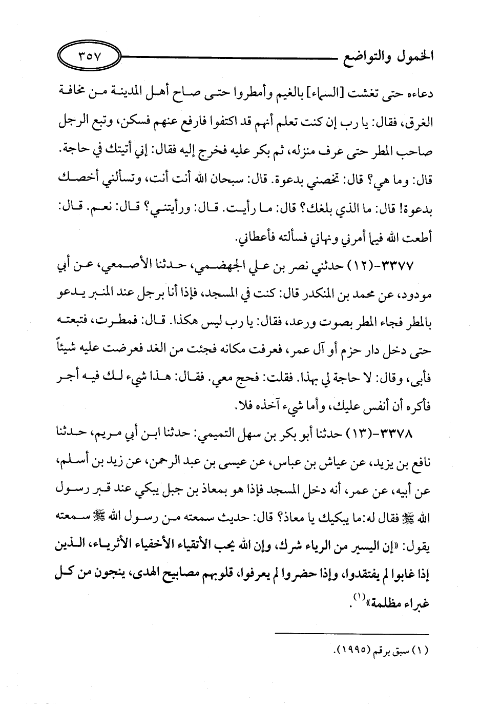 13 - حَدَّثَنَا أَبُو بَكْرِ بْنُ سَهْلٍ التَّمِيمِيُّ، حَدَّثَنَا ابْنُ أَبِي مَرْيَمَ، حَدَّثَنَا نَافِعُ بْنُ يَزِيدَ، عَنْ عَيَّاشِ بْنِ عَبَّاسٍ، عَنْ عِيسَى بْنِ عَبْدِ الرَّحْمَنِ، عَنْ زَيْدِ بْنِ أَسْلَمَ، عَنْ أَبِيهِ، عَنْ عُمَرَ, أَنَّهُ دَخَلَ الْمَسْجِدَ, فَإِذَا هُوَ بِمُعَاذِ بْنِ جَبَلٍ يَبْكِي عِنْدَ قَبْرِ رَسُولِ اللهِ صَلَّى اللَّهُ عَلَيْهِ وَسَلَّمَ، فَقَالَ لَهُ: مَا يُبْكِيكَ يَا مُعَاذُ؟ قَالَ: حَدِيثٌ سَمِعْتُهُ مِنْ رَسُولِ اللهِ صَلَّى اللَّهُ عَلَيْهِ وَسَلَّمَ، سَمِعْتُهُ يَقُولُ: إِنَّ الْيَسِيرَ مِنَ الرِّيَاءِ شِرْكٌ, وَإِنَّ اللَّهَ يُحِبُّ الأَتْقِيَاءَ الأَخْفِيَاءَ الأَثْرِيَاءَ, الَّذِينَ إِذَا غَابُوا لَمْ يُفْقَدُوا، وَإِنْ حَضَرُوا لَمْ يُعْرَفُوا، قُلُوبُهُمْ مَصَابِيحُ الْهُدَى يَنْجُونَ مِنْ كُلِّ غَبْرَاءَ مُظْلِمَةٍ.