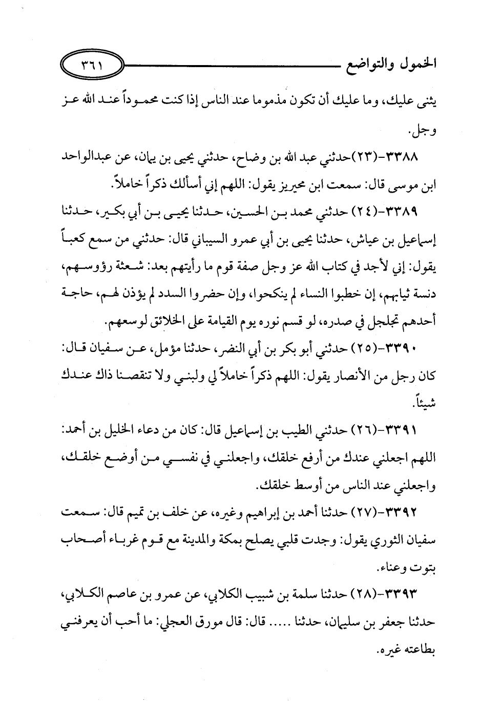 26 - حَدَّثَنِي الطَّيِّبُ بْنُ إِسْمَاعِيلَ، قَالَ: كَانَ مِنْ دُعَاءِ الْخَلِيلِ بْنِ أَحْمَدَ: اللَّهُمَّ اجْعَلْنِي عِنْدَكَ مِنْ أَرْفَعِ خَلْقِكَ، وَاجْعَلْنِي فِي نَفْسِي مِنْ أَوْضَعِ خَلْقِكَ، وَاجْعَلْنِي عِنْدَ النَّاسِ مِنْ أَوْسَطِ خَلْقِكَ.