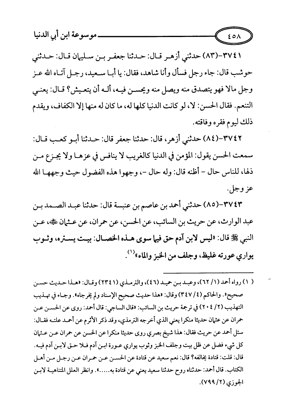 85 - حَدَّثَنِي أَحْمَدُ بْنُ عَاصِمِ بْنِ عَنْبَسَةَ، قَالَ: حَدَّثَنَا عَبْدُ الصَّمَدِ بْنُ عَبْدِ الْوَارِثِ، عَنْ حُرَيْثِ بْنِ السَّائِبِ، عَنِ الْحَسَنِ، عَنْ حُمْرَانَ، عَنْ عُثْمَانَ، رَضِيَ اللَّهُ عَنْهُ، عَنِ النَّبِيِّ صَلَّى اللَّهُ عَلَيْهِ وَسَلَّمَ قَالَ: لَيْسَ لِابْنِ آدَمَ حَقٌّ فِيمَا سِوَى هَذِهِ الْخِصَالِ: بَيْتٌ يَسْتُرُهُ، وَثَوْبٌ يُوَارِي عَوْرَتَهُ غَلِيظٌ، وَجِلْفٌ مِنَ الْخُبْزِ وَالْمَاءِ.