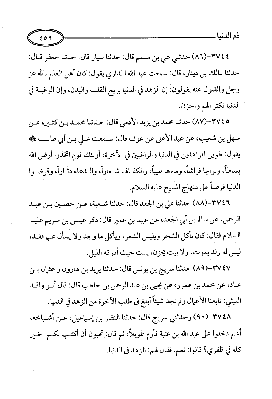 89 - حَدَّثَنَا سُرَيْجُ بْنُ يُونُسَ، قَالَ: حَدَّثَنَا يَزِيدُ بْنُ هَارُونَ، وَعُثْمَانُ بْنُ عَبَّادٍ، عَنْ مُحَمَّدِ بْنِ عَمْرٍو، عَنْ يَحْيَى بْنِ عَبْدِ الرَّحْمَنِ بْنِ حَاطِبٍ، قَالَ: قَالَ أَبُو وَاقِدٍ اللَّيْثِيُّ: تَابَعْنَا الأَعْمَالَ وَلَمْ نَجِدْ شَيْئًا أَبْلَغَ فِي طَلَبِ الْآخِرَةِ مِنَ الزُّهْدِ فِي الدُّنْيَا.