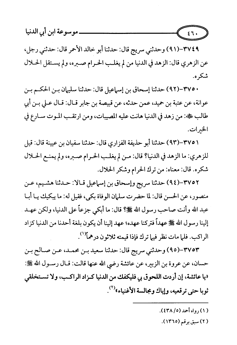 91 - حَدَّثَنِي سُرَيْجٌ، قَالَ: حَدَّثَنَا أَبُو خَالِدٍ الأَحْمَرُ، قَالَ: حَدَّثَنِي رَجُلٌ، عَنِ الزُّهْرِيِّ، قَالَ: الزُّهْدُ فِي الدُّنْيَا: مَنْ لَمْ يَغْلِبِ الْحَرَامُ صَبْرَهُ، وَلَمْ يَسْتَقِلَّ الْحَلاَلُ شُكْرَهُ.