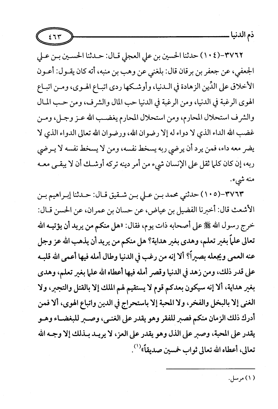 105 - حَدَّثَنِي مُحَمَّدُ بْنُ عَلِيِّ بْنِ شَقِيقٍ، قَالَ: حَدَّثَنَا إِبْرَاهِيمُ بْنُ الأَشْعَثِ، قَالَ: أَخبَرَنا الْفُضَيْلُ بْنُ عِيَاضٍ، عَنْ عِمْرَانَ بْنِ حَسَّانَ، عَنْ الْحَسَنِ، قَالَ: خَرَجَ رَسُولُ اللَّهِ صَلَّى اللَّهُ عَلَيْهِ وَسَلَّمَ عَلَى أَصْحَابِهِ ذَاتَ يَوْمٍ فَقَالَ: هَلْ مِنْكُمْ مَنْ يُرِيدُ أَنْ يُؤْتِيَهُ اللَّهُ تَعَالَى عِلْمًا بِغَيْرِ تَعَلُّمٍ، وَهُدًى بِغَيْرِ هِدَايَةٍ؟ هَلْ مِنْكُمْ مَنْ يُرِيدُ أَنْ يُذْهِبَ اللَّهُ عَزَّ وَجَلَّ عَنْهُ الْعَمَى وَيَجْعَلَهُ بَصِيرًا؟ أَلاَ إِنَّهُ مَنْ رَغِبَ فِي الدُّنْيَا وَطَالَ أَمَلُهُ فِيهَا أَعْمَى اللَّهُ قَلْبَهُ عَلَى قَدْرِ ذَلِكَ، وَمَنْ زَهِدَ فِي الدُّنْيَا وَقَصُرَ أَمَلُهُ فِيهَا أَعْطَاهُ اللَّهُ عِلْمًا بِغَيْرِ تَعَلُّمٍ، وَهُدًى بِغَيْرَ هِدَايَةٍ، أَلاَ إِنَّهُ سَيَكُونُ بَعْدَكُمْ قَوْمٌ لاَ يَسْتَقِيمُ لَهُمُ الْمُلْكُ إِلَّا بِالْقَتْلِ وَالتَّجَبُّرِ، وَلاَ الْغِنَى إِلَّا بِالْبُخْلِ وَالْفَخْرِ، وَلاَ الْمَحَبَّةُ إِلَّا بِاسْتِحرَاجٍ فِي الدِّينِ وَاتِّبَاعِ الْهَوَى، أَلاَ فَمَنْ أَدْرَكَ ذَلِكَ الزَّمَنَ مِنْكُمْ فَصَبَرَ لِلْفَقْرِ وَهُوَ يَقْدِرُ عَلَى الْغِنَى، وَصَبَرَ لِلْبَغْضَاءِ وَهُوَ يَقْدِرُ عَلَى الْمَحَبَّةِ، وَصَبَرَ عَلَى الذُّلِّ وَهُوَ يَقْدِرُ عَلَى الْعِزِّ، لاَ يُرِيدُ بِذَلِكَ إِلَّا وَجْهَ اللَّهِ تَعَالَى، أَعْطَاهُ اللَّهُ تَعَالَى ثَوَابَ خَمْسِينَ صِدِّيقًا.