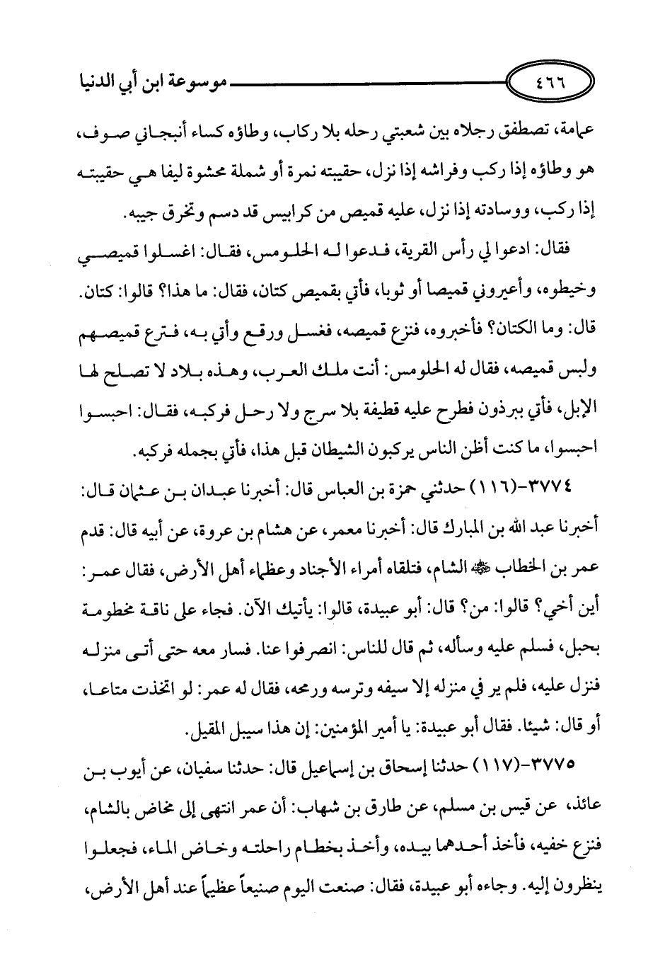 116 - حَدَّثَنِي حَمْزَةُ بْنُ الْعَبَّاسِ، قَالَ: أَخْبَرَنَا عَبْدَانُ بْنُ عُثْمَانَ، قَالَ: أَخْبَرَنَا عَبْدُ اللَّهِ بْنُ الْمُبَارَكِ، قَالَ: أَخْبَرَنَا مَعْمَرٌ، عَنْ هِشَامِ بْنِ عُرْوَةَ، عَنْ أَبِيهِ، قَالَ: قَدِمَ عُمَرُ بْنُ الْخَطَّابِ رَضِيَ اللَّهُ عَنْهُ الشَّامَ، فَتَلَقَّاهُ أُمَرَاءُ الأَجْنَادِ وَعُظَمَاءُ أَهْلِ الأَرْضِ، فَقَالَ عُمَرُ: أَيْنَ أَخِي؟ قَالُوا: مَنْ؟ قَالَ: أَبُو عُبَيْدَةَ، قَالُوا: يَأْتِيكَ الآنَ. فَجَاءَ عَلَى نَاقَةٍ مَخْطُومَةٍ بِحَبْلٍ، فَسَلَّمَ عَلَيْهِ وَسَأَلَهُ، ثُمَّ قَالَ لِلنَّاسِ: انْصَرَفُوا عنا. فَسَارَ مَعَهُ حَتَّى أَتَى مَنْزِلَهُ فَنَزَلَ عَلَيْهِ، فَلَمْ يَرَ فِي مَنْزِلِهِ إِلَّا سَيْفَهُ وَتُرْسَهُ وَرِمحهُ، فَقَالَ لَهُ عُمَرُ: لَوِ اتَّخَذْتَ مَتَاعًا، أَوْ قَالَ شَيْئًا. فَقَالَ أَبُو عُبَيْدَةَ: يَا أَمِيرَ الْمُؤْمِنِينَ: إِنَّ هَذَا سَيُبَلِّ الْمَقِيلَ.