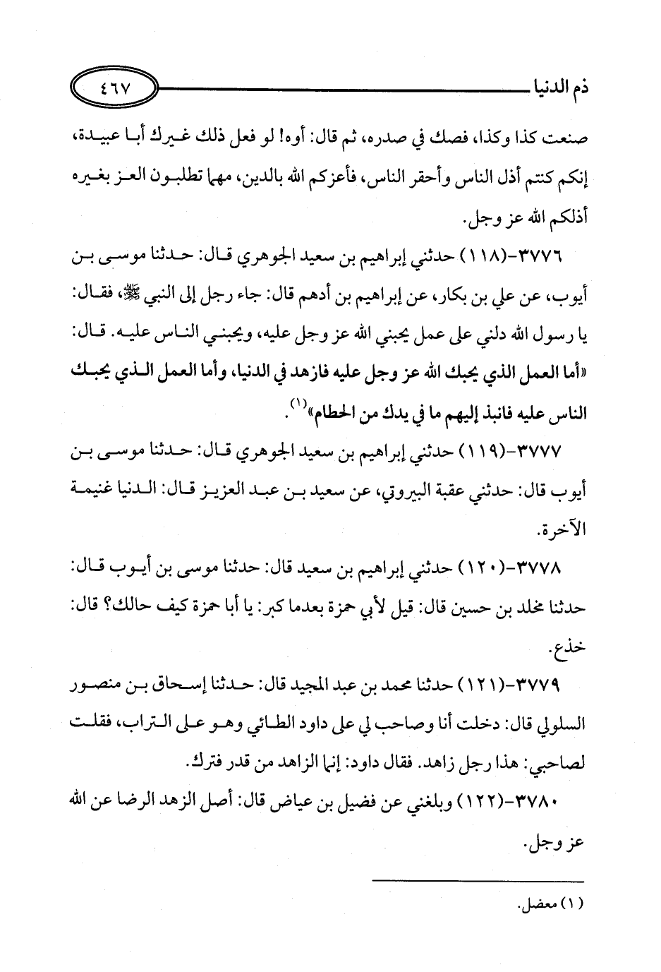 118 - حَدَّثَنِي إِبْرَاهِيمُ بْنُ سَعِيدٍ الْجَوْهَرِيُّ، قَالَ: حَدَّثَنَا مُوسَى بْنُ أَيُّوبَ، عَنْ عَلِيِّ بْنِ بَكَّارٍ، عَنْ إِبْرَاهِيمَ بْنِ أَدْهَمَ، قَالَ: جَاءَ رَجُلٌ إِلَى النَّبِيِّ صَلَّى اللَّهُ عَلَيْهِ وَسَلَّمَ فَقَالَ: يَا رَسُولَ اللَّهِ دُلَّنِي عَلَى عَمَلٍ يُحِبُّنِي اللَّهُ عَزَّ وَجَلَّ عَلَيْهِ، وَيُحِبُّنِي النَّاسُ عَلَيْهِ قَالَ: أَمَّا الْعَمَلُ الَّذِي يُحِبُّكَ اللَّهُ عَزَّ وَجَلَّ عَلَيْهِ فَازْهَدْ فِي الدُّنْيَا، وَأَمَّا الْعَمَلُ الَّذِي يُحِبُّكَ النَّاسُ عَلَيْهِ فَانْبِذْ إِلَيْهِمْ مَا فِي يَدِكَ مِنَ الْحُطَامِ.