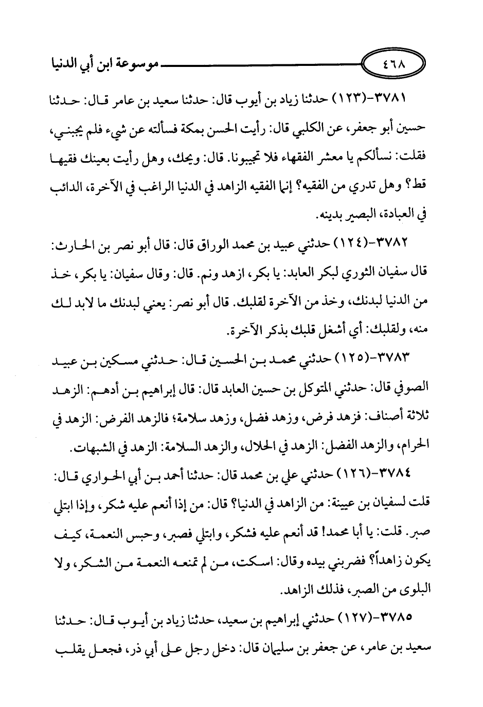 125 - حَدَّثَنِي مُحَمَّدُ بْنُ الْحُسَيْنِ، قَالَ: حَدَّثَنِي مِسْكِينُ بْنُ عُبَيْدٍ الصُّوفِيُّ، قَالَ: حَدَّثَنِي الْمُتَوَكِّلُ بْنُ حُسَيْنٍ الْعَابِدُ، قَالَ: قَالَ إِبْرَاهِيمُ بْنُ أَدْهَمَ: الزُّهْدُ ثَلاَثَةُ أَصْنَافٍ، فَزُهْدٌ فَرْضٌ، وَزُهْدٌ فَضْلٌ، وَزُهْدٌ سَلاَمَةٌ فَالزُّهْدُ الْفَرْضُ: الزُّهْدُ فِي الْحَرَامِ، وَالزُّهْدُ الْفَضْلُ: الزُّهْدُ فِي الْحَلاَلِ، وَالزُّهْدُ السَّلاَمَةُ: الزُّهْدُ فِي الشُّبُهَاتِ.