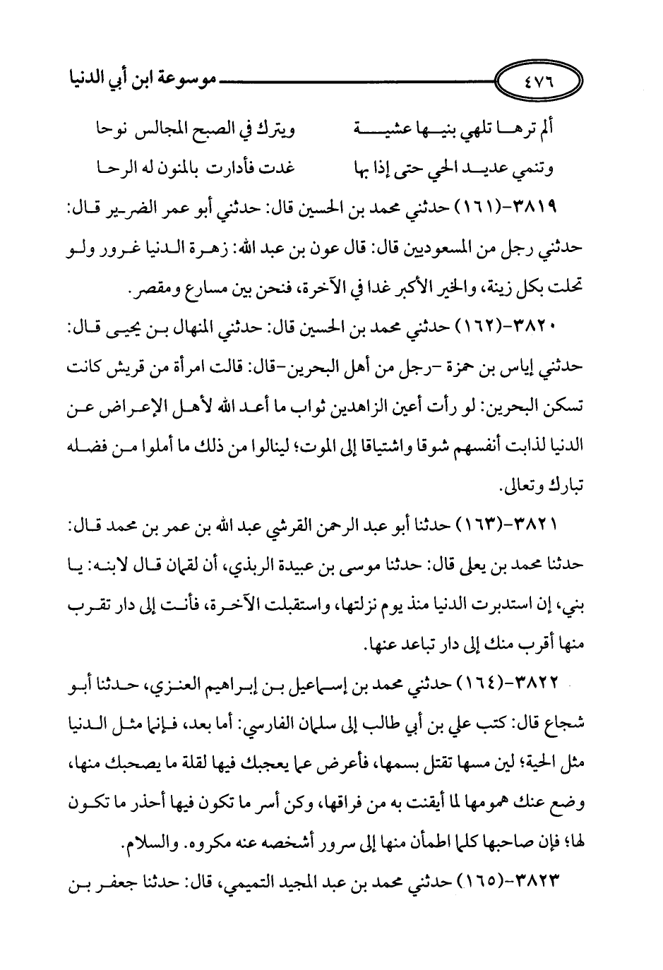 164 - حَدَّثَنِي مُحَمَّدُ بْنُ إِسْمَاعِيلَ بْنِ إِبْرَاهِيمَ الْعَنَزِيُّ، حَدَّثَنَا أَبُو شُجَاعٍ، قَالَ: كَتَبَ عَلِيُّ بْنُ أَبِي طَالِبٍ إِلَى سَلْمَانَ الْفَارِسِيِّ: أَمَّا بَعْدُ فَإِنَّمَا مَثَلُ الدُّنْيَا مَثَلُ الْحَيَّةِ: لَيِّنٌ مَسُّهَا تَقْتُلُ بِسُمِّهَا، فَأَعْرِضْ عَمَّا يُعْجِبُكَ فِيهَا لِقِلَّةِ مَا يَصْحَبُكَ مِنْهَا، وَضَعْ عَنْكَ هُمُومَهَا لِمَا أَيْقَنْتَ بِهِ مِنْ فِرَاقِهَا، وَكُنْ أَسَرَّ مَا تَكُونُ فِيهَا أَحْذَرَ مَا تَكُونُ لَهَا، فَإِنَّ صَاحِبَهَا كُلَّمَا اطْمَأَنَّ مِنْهَا إِلَى سُرُورٍ أَشْخَصَهُ عَنْهُ مَكْرُوهٌ، وَالسَّلاَمُ.