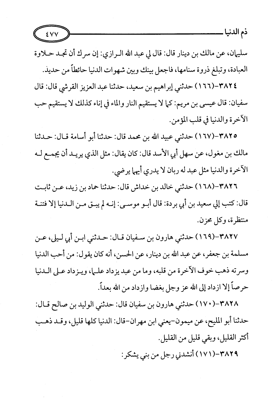 169 - حَدَّثَنِي هَارُونُ بْنُ سُفْيَانَ، قَالَ: حَدَّثَنِي ابْنُ أَبِي لَيْلَى، عَنْ مَسْلَمَةَ بْنِ جَعْفَرٍ، عَنْ عَبْدِ اللَّهِ بْنِ دِينَارٍ، عَنِ الْحَسَنِ، أَنَّهُ كَانَ يَقُولُ: مَنْ أَحَبَّ الدُّنْيَا وَسَرَّتْهُ ذَهَبَ خَوْفُ الْآخِرَةِ مِنْ قَلْبِهِ، وَمَا مِنْ عَبْدِ يَزْدَادُ عِلْمًا وَيَزْدَادُ عَلَى الدُّنْيَا حِرْصًا، إِلَّا ازْدَادَ إِلَى اللَّهِ عَزَّ وَجَلَّ بُغْضًا، وَازْدَادَ مِنَ اللَّهِ بُعْدًا.
