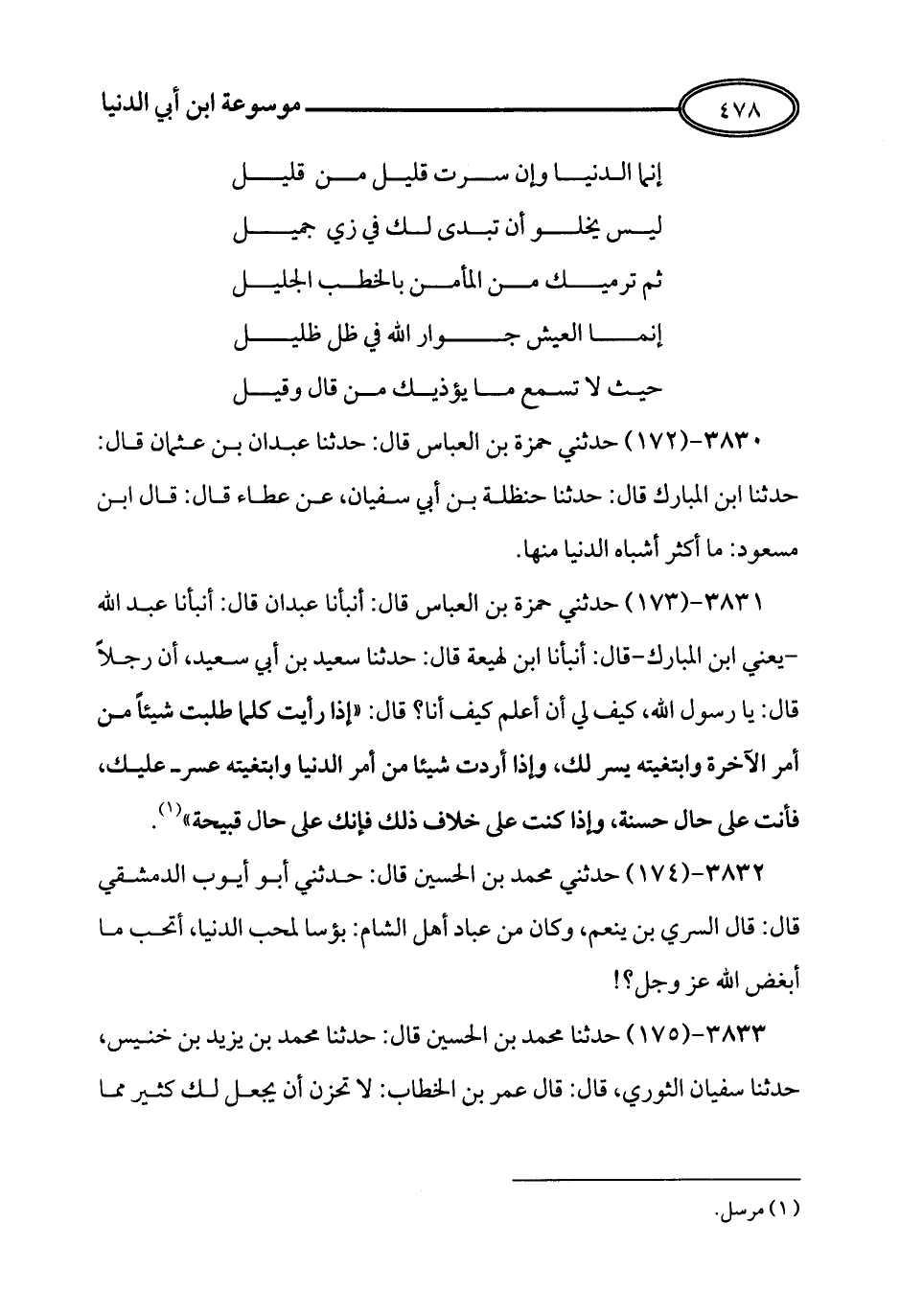 174 - حَدَّثَنِي مُحَمَّدُ بْنُ الْحُسَيْنِ، قَالَ: حَدَّثَنِي أَبُو أَيُّوبَ الدِّمَشْقِيُّ، قَالَ: قَالَ السَّرِيُّ بْنُ يَنْعُمَ، وَكَانَ مِنْ عُبَّادِ أَهْلِ الشَّامِ: بُؤْسًا لِمُحِبِّ الدُّنْيَا، أَتُحِبُّ مَا أَبْغَضَ اللَّهُ عَزَّ وَجَلَّ؟.
