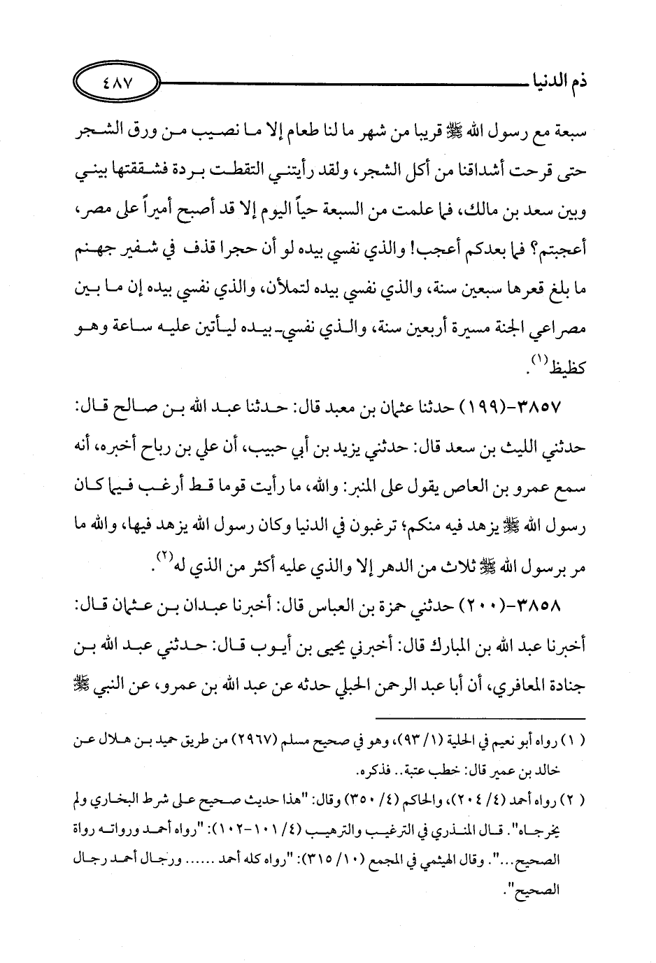 199 - حَدَّثَنَا عُثْمَانُ بْنُ مَعْبَدٍ، قَالَ: حَدَّثَنَا عَبْدُ اللَّهِ بْنُ صَالِحٍ، قَالَ: حَدَّثَنِي اللَّيْثُ بْنُ سَعْدٍ، قَالَ: حَدَّثَنِي يَزِيدُ بْنُ أَبِي حَبِيبٍ، أَنَّ عَلِيَّ بْنَ رَبَاحٍ، أَخْبَرَهُ أَنَّهُ سَمِعَ عَمْرَو بْنَ الْعَاصِ، يَقُولُ عَلَى الْمِنْبَرِ: وَاللَّهِ مَا رَأَيْتُ قَوْمًا قَطُّ أَرْغَبَ فِيمَا كَانَ رَسُولُ اللَّهِ صَلَّى اللَّهُ عَلَيْهِ وَسَلَّمَ يَزْهَدُ فِيهِ مِنْكُمْ، تَرْغَبُونَ فِي الدُّنْيَا وَكَانَ رَسُولُ اللَّهِ صَلَّى اللَّهُ عَلَيْهِ وَسَلَّمَ يَزْهَدُ فِيهَا، وَاللَّهِ مَا مَرَّ بِرَسُولِ اللَّهِ صَلَّى اللَّهُ عَلَيْهِ وَسَلَّمَ ثَلاَثٌ مِنَ الدَّهْرِ إِلَّا وَالَّذِي عَلَيْهِ أَكْثَرُ مِنَ الَّذِي لَهُ.