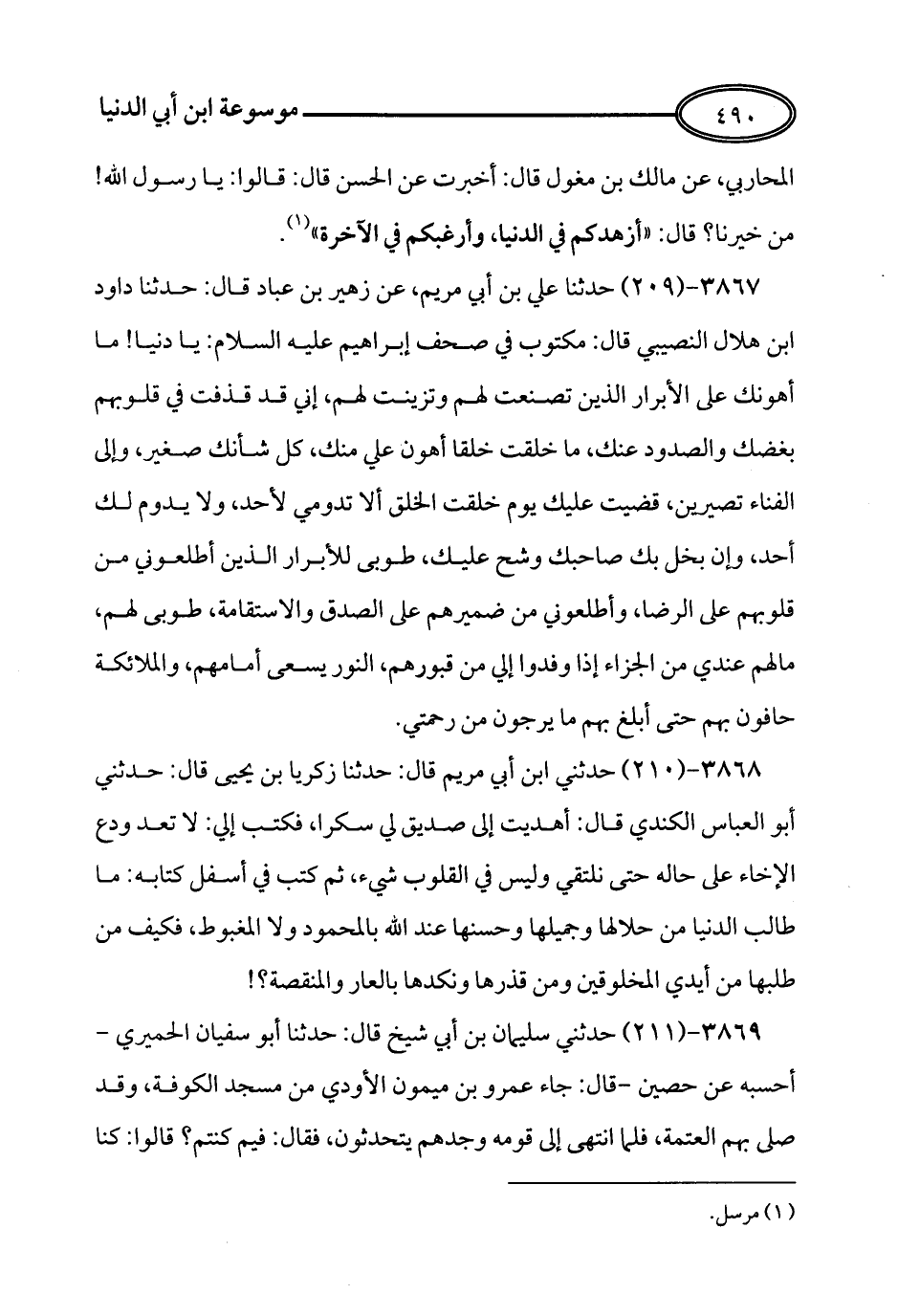 209 - حَدَّثَنَا عَلِيُّ بْنُ أَبِي مَرْيَمَ، عَنْ زُهَيْرِ بْنِ عَبَّادٍ، قَالَ: حَدَّثَنَا دَاوُدُ بْنُ هِلاَلٍ النَّصِيبِيُّ، قَالَ: مَكْتُوبٌ فِي صُحُفِ إِبْرَاهِيمَ عَلَيْهِ السَّلاَمُ: يَا دُنْيَا مَا أَهْوَنَكِ عَلَى الأَبْرَارِ الَّذِينَ تَصَنَّعْتِ لَهُمْ، وَتَزَيَّنْتِ لَهُمْ إِنِّي قَدْ قَذَفْتُ فِي قُلُوبِهِمْ بُغْضَكِ وَالصُّدُودَ عَنْكِ، مَا خَلَقْتُ خَلْقًا أَهْوَنَ عَلَيَّ مِنْكِ، كُلُّ شَأْنِكِ صَغِيرٌ، وَإِلَى الْفَنَاءِ تَصِيرِينَ، قَضَيْتُ عَلَيْكِ يَوْمَ خَلَقْتُ الْخَلْقَ أَلَّا تَدُومِي لِأَحَدٍ، وَلاَ يَدُومُ لَكِ أَحَدٌ، وَإِنْ بَخِلَ بِكِ صَاحِبُكِ وَشَحَّ عَلَيْكِ، طُوبَى لِلأَبْرَارِ الَّذِينَ أَطْلَعُونِي مِنْ قُلُوبِهِمْ عَلَى الرِّضَا، وَأَطْلَعُونِي مِنْ ضَمِيرِهِمْ عَلَى الصِّدْقِ وَالِاسْتِقَامَةِ، طُوبَى لَهُمْ مَا لَهُمْ عِنْدِي مِنَ الْجَزَاءِ إِذَا وَفَدُوا إِلَيَّ مِنْ قُبُورِهِمْ إِلَّا النُّورُ يَسْعَى أَمَامَهُمْ، وَالْمَلاَئِكَةُ حَافُّونَ بِهِمْ حَتَّى أَبْلُغَ بِهِمْ مَا يَرْجُونَ مِنْ رَحْمَتِي.