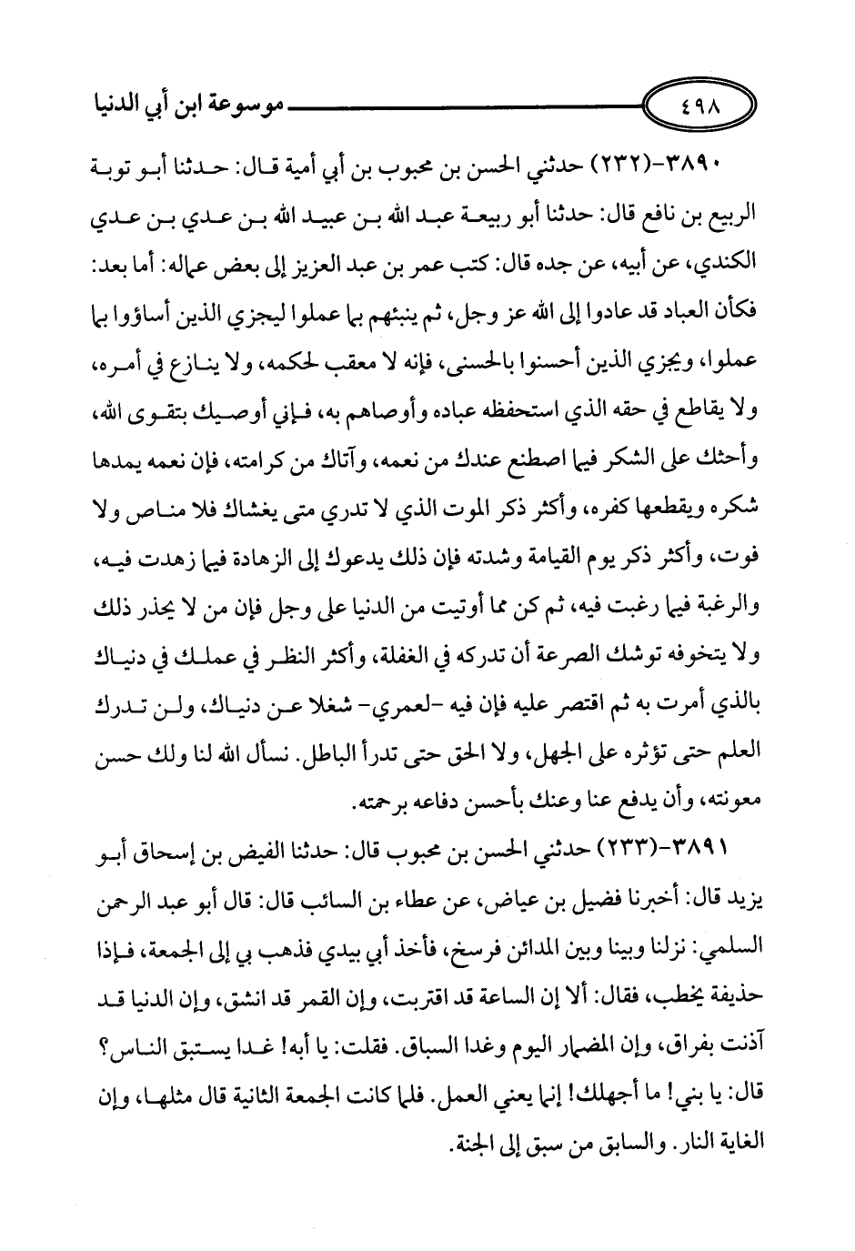 232 - حَدَّثَنِي الْحَسَنُ بْنُ مَحْبُوبٍ بْنِ أَبِي أُمَيَّةَ، قَالَ: حَدَّثَنَا أَبُو تَوْبَةَ الرَّبِيعُ بن نافع، قَالَ: حَدَّثَنَا أَبُو رَبِيعَةَ عَبْدُ اللَّهِ بْنُ عُبَيْدِ بْنِ عَدِيِّ بْنِ عَدِيٍّ الْكِنْدِيُّ، عَنْ أَبِيهِ، عَنْ جَدِّهِ، قَالَ: كَتَبَ عُمَرُ بْنُ عَبْدِ الْعَزِيزِ إِلَى بَعْضِ عُمَّالِهِ: أَمَّا بَعْدُ: فَكَأَنَّ الْعِبَادَ قَدْ عَادُوا إِلَى اللَّهِ عَزَّ وَجَلَّ، ثُمَّ يُنَبِّئُهُمْ بِمَا عَمِلُوا لِيَجْزِيَ الَّذِينَ أَسَاؤُوا بِمَا عَمِلُوا وَيَجْزِيَ الَّذِينَ أَحْسَنُوا بِالْحُسْنَى، فَإِنَّهُ لاَ مُعَقِّبَ لِحُكْمِهِ، وَلاَ يُنَازَعُ فِي أَمْرِهِ، وَلاَ يُقَاطَعُ فِي حَقِّهِ الَّذِي اسْتَحْفَظَهُ عِبَادَهُ وَأَوْصَاهُمْ بِهِ، فَإِنِّي أُوصِيكَ بِتَقْوَى اللَّهِ، وَأَحُثُّكَ عَلَى الشُّكْرِ فِيمَا اصْطَنَعَ عِنْدَكَ مِنْ نِعَمِهِ، وَآتَاكَ مِنْ كَرَامَتِهِ، فَإِنَّ نِعَمَهُ يَمُدُّهَا شُكْرُهُ، وَيَقْطَعُهَا كُفْرُهُ , وَأَكْثِرْ ذِكْرَ الْمَوْتِ الَّذِي لاَ تَدْرِي مَتَى يَغْشَاكَ، فَلاَ مَنَاصَ وَلاَ فَوْتَ. وَأَكْثِرْ ذِكْرَ يَوْمِ الْقِيَامَةِ وَشِدَّتَهُ، فَإِنَّ ذَلِكَ يَدْعُوكَ إِلَى الزَّهَادَةِ فِيمَا زَهِدْتَ فِيهِ، وَالرَّغْبَةِ فِيمَا رَغِبْتَ فِيهِ. ثُمَّ كُنْ مِمَّا أُوتِيتَ مِنَ الدُّنْيَا عَلَى وَجَلٍ، فَإِنَّ مَنْ لاَ يَحْذَرُ ذَلِكَ وَلاَ يَتَخَوَّفُهُ، تُوشِكُ الصَّرْعَةُ أَنْ تُدْرِكَهُ فِي الْغَفْلَةِ. وَأَكْثِرِ النَّظَرَ فِي عَمَلِكَ فِي دُنْيَاكَ بِالَّذِي أُمِرْتَ بِهِ، ثُمَّ اقْتَصِرْ عَلَيْهِ، فَإِنَّ فِيهِ - لَعَمْرِي - شُغْلًا عَنْ دُنْيَاكَ، وَلَنْ تُدْرِكَ الْعِلْمَ حَتَّى تُؤْثِرَهُ عَلَى الْجَهْلِ، وَلاَ الْحَقَّ حَتَّى تَدْرَأَ الْبَاطِلَ. نَسْأَلُ اللَّهَ لَنَا وَلَكَ حُسْنَ مَعُونَتَهُ، وَأَنْ يَدْفَعَ عَنَّا وَعَنْكَ بِأَحْسَنِ دِفَاعِهِ بِرَحْمَتِهِ.