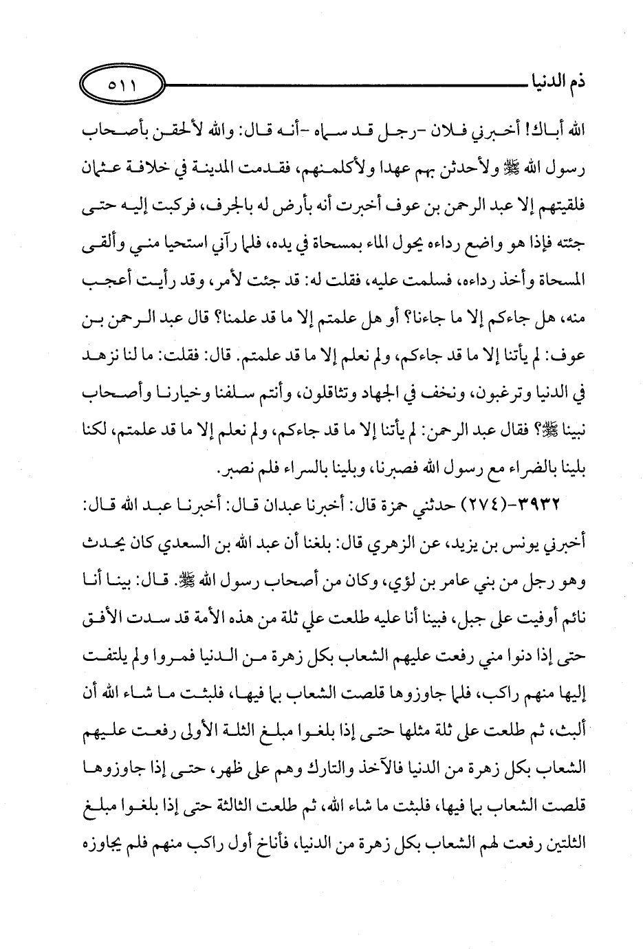 274 - حَدَّثَنِي حَمْزَةُ، قَالَ: أَخبَرَنا عَبْدَانُ، قَالَ: أَخبَرَنا عَبْدُ اللَّهِ، قَالَ: أَخْبَرَنِي يُونُسُ بْنُ يَزِيدَ، عَنِ الزُّهْرِيِّ، قَالَ: بَلَغَنَا أَنَّ عَبْدَ اللَّهِ بْنَ السَّعْدِيِّ كَانَ يُحَدِّثُ، وَهُوَ رَجُلٌ مِنْ بَنِي عَامِرِ بْنِ لُؤَيٍّ، وَكَانَ مِنْ أَصْحَابِ رَسُولِ اللَّهِ صَلَّى اللَّهُ عَلَيْهِ وَسَلَّمَ قَالَ: بَيْنَا أَنَا نَائِمٌ أَوْفَيْتُ عَلَى جَبَلٍ، فَبَيْنَا أَنَا عَلَيْهِ طَلَعَتْ عَلَيَّ ثُلَّةٌ مِنْ هَذِهِ الْأُمَّةِ قَدْ سَدَّتِ الْأُفُقَ، حَتَّى إِذَا دَنَوْا مِنِّي رُفِعَتْ عَلَيْهِمُ الشِّعَابُ بِكُلِّ زَهْرَةٍ مِنَ الدُّنْيَا، فَمَرُّوا وَلَمْ يَلْتَفِتْ إِلَيْهَا مِنْهُمْ رَاكِبٌ، فَلَمَّا جَاوَزُوهَا قَلَصَتِ الشِّعَابُ بِمَا فِيهَا، فَلَبِثْتُ مَا شَاءَ اللَّهُ أَنْ أَلْبَثَ، ثُمَّ طَلَعَتْ عَلَيَّ ثُلَّةٌ مِثْلُهَا، حَتَّى إِذَا بَلَغُوا مَبْلَغَ الثُّلَّةِ الْأُولَى رُفِعَتْ عَلَيْهِمُ الشِّعَابُ بِكُلِّ زَهْرَةٍ مِنَ الدُّنْيَا، فَالآخِذُ وَالتَّارِكُ وَهُمْ عَلَى ظَهْرٍ، حَتَّى إِذَا جَاوَزُوهَا قَلَصَتِ الشِّعَابُ بِمَا فِيهَا، فَلَبِثْتُ مَا شَاءَ اللَّهُ، ثُمَّ طَلَعَتِ الثَّالِثَةُ، حَتَّى إِذَا بَلَغُوا مَبْلَغَ الثُّلَّتَيْنِ رُفِعَتْ لَهُمُ الشِّعَابُ بِكُلِّ زَهْرَةٍ مِنَ الدُّنْيَا، فَأَنَاخَ أَوَّلُ رَاكِبٍ مِنْهُمْ، فَلَمْ يُجَاوِزْهُ رَاكِبٌ، فَنَزَلُوا يَهْتَالُونَ مِنَ الدُّنْيَا، فَعَهْدِي بِالْقَوْمِ وَهُمْ يَهْتَالُونَ وَقَدْ ذَهَبَتِ الرِّكَابُ.