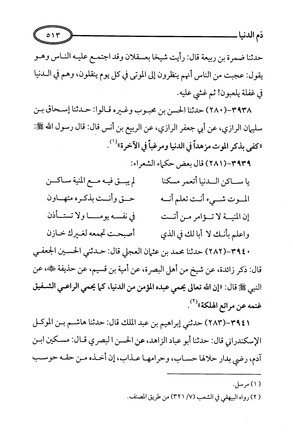 282 - حَدَّثَنَا مُحَمَّدُ بْنُ عُثْمَانَ الْعِجْلِيُّ، قَالَ: حَدَّثَنِي الْحُسَيْنُ الْجُعْفِيُّ، قَالَ: ذَكَرَ زَائِدَةُ عَنْ شَيْخٍ مِنْ أَهْلِ الْبَصْرَةِ عَنْ أُمَيَّةَ بْنِ قُسَيْمٍ، عَنْ حُذَيْفَةَ، رَضِيَ اللَّهُ عَنْهُ، عَنِ النَّبِيِّ صَلَّى اللَّهُ عَلَيْهِ وَسَلَّمَ قَالَ: إِنَّ اللَّهَ تَعَالَى يَحْمِي عَبْدَهُ الْمُؤْمِنَ مِنَ الدُّنْيَا، كَمَا يَحْمِي الرَّاعِي الشَّفِيقُ غَنَمَهُ عَنْ مَرَاتِعِ الْهَلَكَةِ.