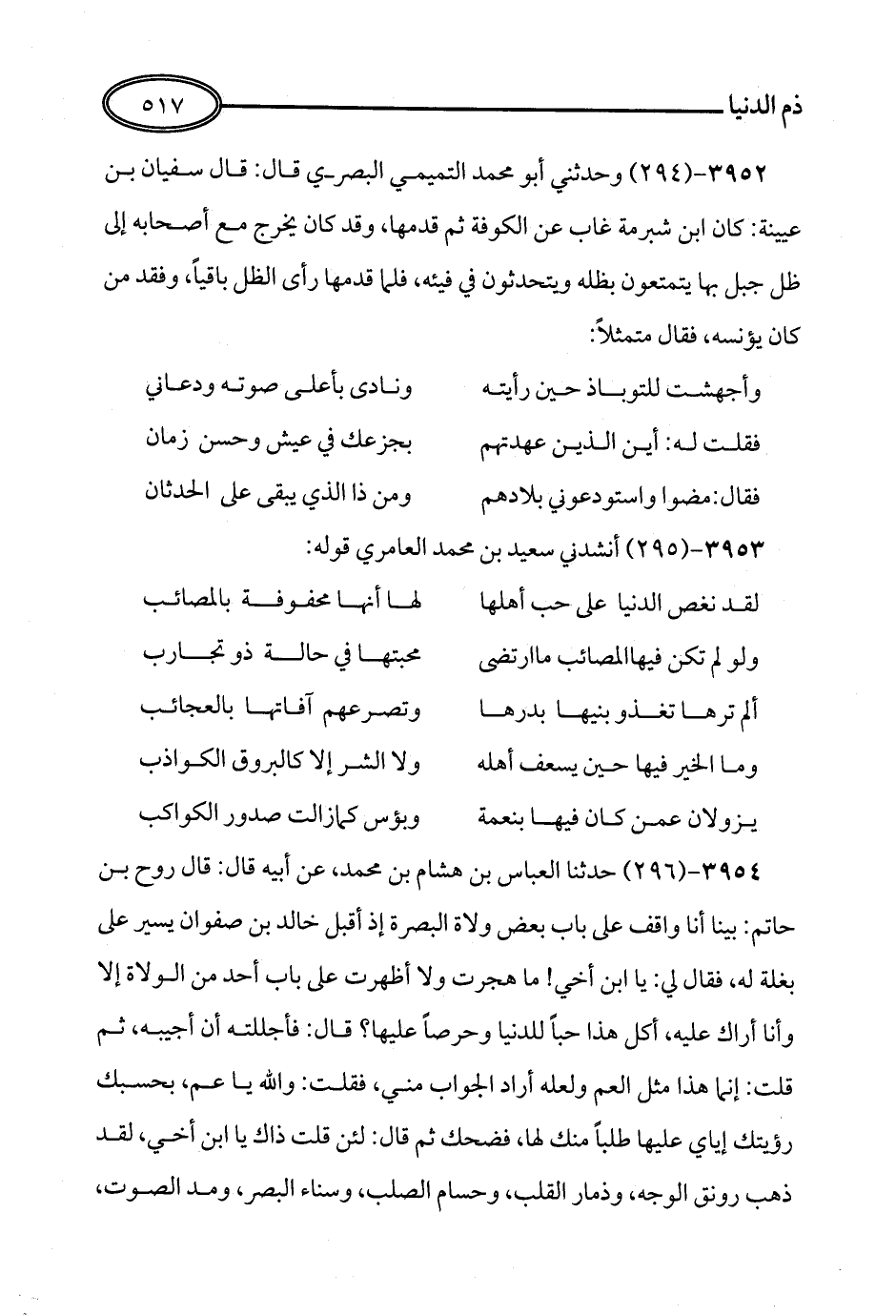 296 - حَدَّثَنَا الْعَبَّاسُ بْنُ هِشَامِ بْنِ مُحَمَّدٍ، عَنْ أَبِيهِ، قَالَ: قَالَ رَوْحُ بْنُ حَاتِمٍ: بَيْنَا أَنَا وَاقِفٌ عَلَى بَابِ بَعْضِ وُلاَةِ الْبَصْرَةِ إِذْ أَقْبَلَ خَالِدُ بْنُ صَفْوَانَ يَسِيرُ عَلَى بَغْلَةٍ لَهُ، فَقَالَ لِي: يَا ابْنَ أَخِي، مَا هَجَّرْتُ، وَلاَ أَظْهَرْتُ عَلَى بَابِ أَحَدٍ مِنَ الْوُلاَةِ إِلَّا وَأَنَا أَرَاكَ عَلَيْهِ، أَكُلُّ هَذَا حُبًّا لِلدُّنْيَا وَحِرْصًا عَلَيْهَا؟ قَالَ: فَأَجْلَلْتُهُ أَنْ أُجِيبَهُ، ثُمَّ قُلْتُ: إِنَّمًا هَذَا مِثْلُ الْعَمِّ، وَلَعَلَّهُ أَرَادَ الْجَوَابَ مِنِّي، فَقُلْتُ: وَاللَّهِ يَا عَمِّ بِحَسْبِكَ رُؤْيَتُكَ إِيَّايَ عَلَيْهَا طَلَبًا مِنْكَ لَهَا، فَضَحِكَ، ثُمَّ قَالَ: لَئِنْ قُلْتَ ذَاكَ يَا ابْنَ أَخِي، لَقَدْ ذَهَبَ رَوْنَقُ الْوَجْهِ، وَذِمَارُ الْقَلْبِ، وَحُسَامُ الصُّلْبِ، وَسَنَاءُ الْبَصَرِ، وَمَدُّ الصَّوْتِ، وَمَاءُ الشَّبَابِ، وَاقْتَرَبَ عِهَادُ الْعِلَلِ، وَاللَّهِ مَا أَتَتْ عَلَيْنَا سَاعَةٌ مِنْ أَعْمَارِنَا إِلَّا وَنَحْنُ نُؤْثِرُ الدُّنْيَا عَلَى مَا سِوَاهَا، ثُمَّ لاَ تَزْدَادُ لَنَا إِلَّا تَخَلِّيًا، وَعَنَّا إِلَّا تَوَلِّيًا، ثُمَّ ضَرَبَ دَابَّتَهُ وَذَهَبَ.