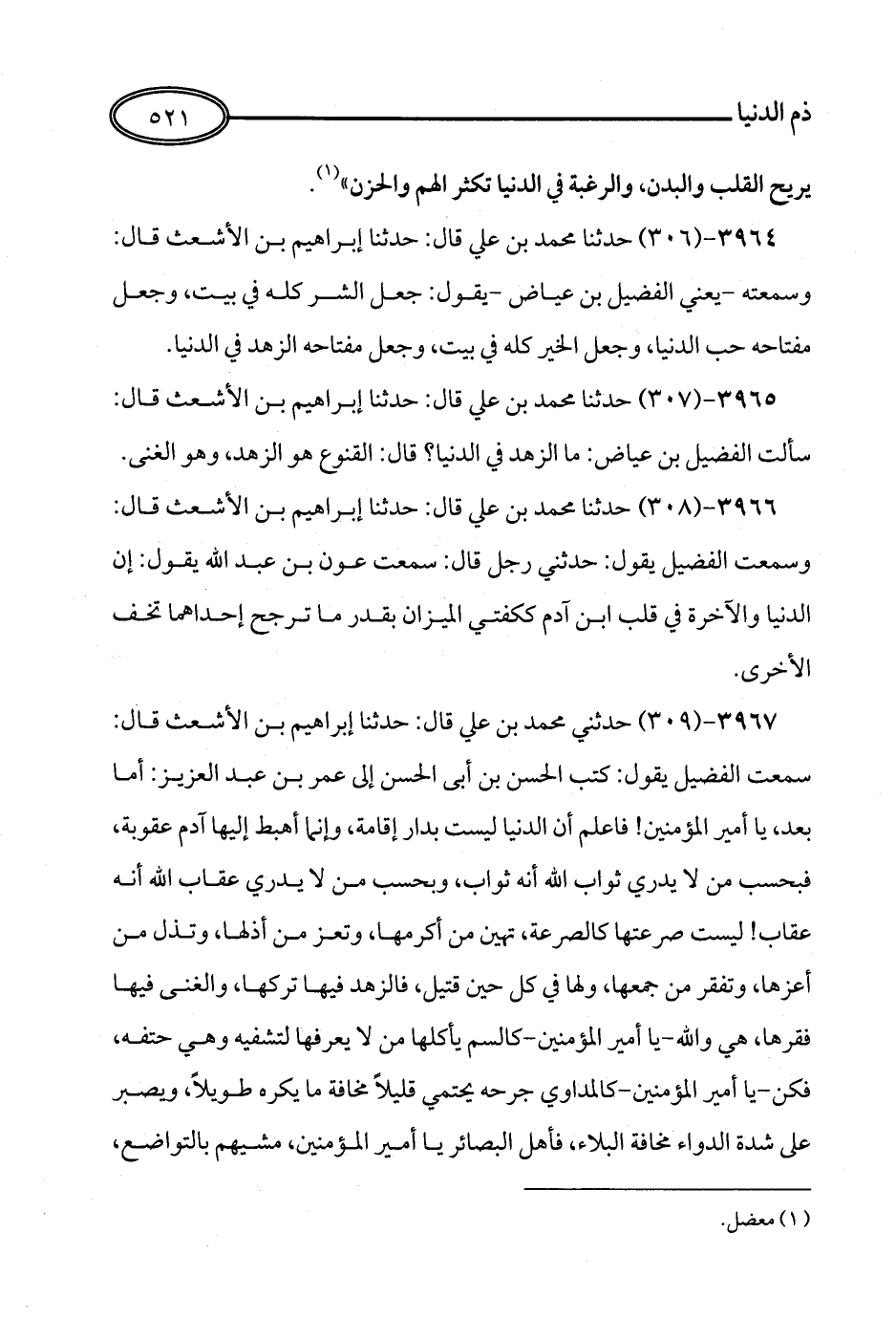 309 - حَدَّثَنِي مُحَمَّدُ بْنُ عَلِيٍّ، قَالَ: حَدَّثَنَا إِبْرَاهِيمُ بْنُ الأَشْعَثِ، قَالَ: سَمِعْتُ الْفُضَيْلَ، يَقُولُ: كَتَبَ الْحَسَنُ بْنُ أَبِي الْحَسَنِ إِلَى عُمَرَ بْنِ عَبْدِ الْعَزِيزِ: أَمَّا بَعْدُ يَا أَمِيرَ الْمُؤْمِنِينَ فَاعْلَمْ أَنَّ الدُّنْيَا لَيْسَتْ بِدَارِ إِقَامَةٍ، وَإِنَّمَا أُهْبِطَ إِلَيْهَا آدَمُ عُقُوبَةً، فَبِحَسْبِ مَنْ لاَ يَدْرِي ثَوَابَ اللَّهِ أَنَّهُ ثَوَابٌ، وَبِحَسْبِ مَنْ لاَ يَدْرِي عِقَابَ اللَّهِ أَنَّهُ عِقَابٌ، لَيْسَتْ صَرْعَتُهَا كَالصَّرْعَةِ، تُهِينُ مَنْ أَكْرَمَهَا، وَتُعِزُّ مَنْ أَذَلَّهَا، وَتُذِلُّ مَنْ أَعَزَّهَا، وَتُفْقِرُ مَنْ جَمَعَهَا، وَلَهَا فِي كُلِّ حِينٍ قَتِيلٌ، فَالزُّهْدُ فِيهَا تَرْكُهَا، وَالْغِنَى فِيهَا فَقْرُهَا، هِيَ وَاللَّهِ يَا أَمِيرَ الْمُؤْمِنِينَ كَالسُّمِّ يَأْكُلُهَا مَنْ لاَ يَعْرِفُهَا لِتَشْفِيَهُ، وَهِيَ حَتْفُهُ،