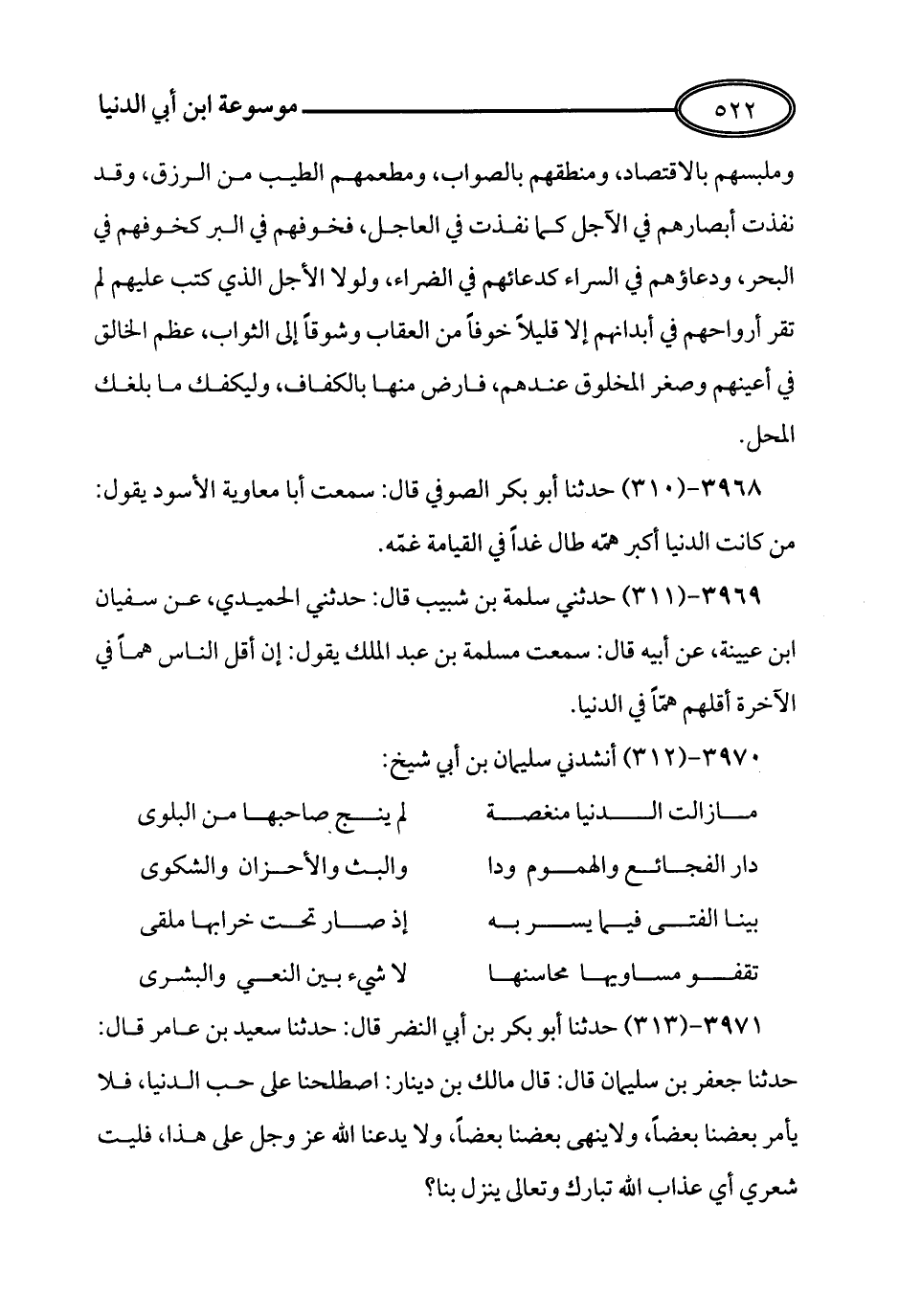 311 - حَدَّثَنِي سَلَمَةُ بْنُ شَبِيبٍ، قَالَ: حَدَّثَنِي الْحُمَيْدِيُّ، عَنْ سُفْيَانَ بْنِ عُيَيْنَةَ، عَنْ أَبِيهِ، قَالَ: سَمِعْتُ مَسْلَمَةَ بْنَ عَبْدِ الْمَلِكِ، يَقُولُ: إِنَّ أَقَلَّ النَّاسِ هَمًّا فِي الْآخِرَةِ أَقَلُّهُمْ هَمًّا فِي الدُّنْيَا.