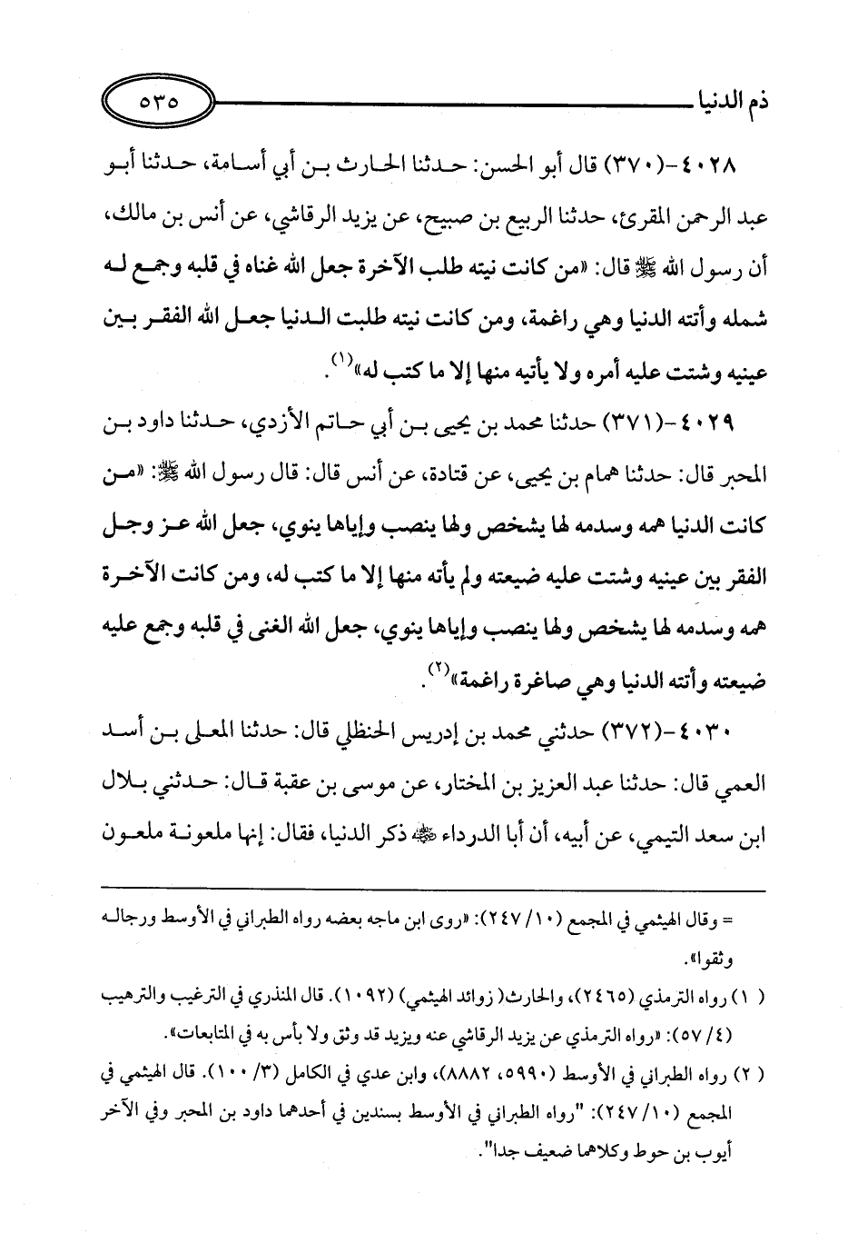 370 - قَالَ أَبُو الْحَسَنِ: حَدَّثَنَا الْحَارِثُ بْنُ أَبِي أُسَامَةَ، حَدَّثَنَا أَبُو عَبْدِ الرَّحْمَنِ الْمُقْرِئُ، حَدَّثَنَا الرَّبِيعُ بْنُ صَبِيحٍ، عَنْ يَزِيدَ الرَّقَاشِيِّ، عَنْ أَنَسِ بْنِ مَالِكٍ، أَنَّ رَسُولَ اللَّهِ صَلَّى اللَّهُ عَلَيْهِ وَسَلَّمَ قَالَ: مَنْ كَانَتْ نِيَّتُهُ طَلَبَ الْآخِرَةِ جَعَلَ اللَّهُ غِنَاهُ فِي قَلْبِهِ، وَجَمَعَ لَهُ شَمْلَهُ، وَأَتَتْهُ الدُّنْيَا وَهِيَ رَاغِمَةٌ، وَمَنْ كَانَتْ نِيَّتُهُ طَلَبَ الدُّنْيَا جَعَلَ اللَّهُ الْفَقْرَ بَيْنَ عَيْنَيْهِ، وَشَتَّتَ عَلَيْهِ أَمْرَهُ، وَلاَ يَأْتِيهِ مِنْهَا إِلَّا مَا كُتِبَ لَهُ.